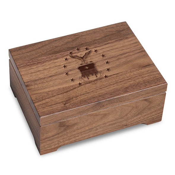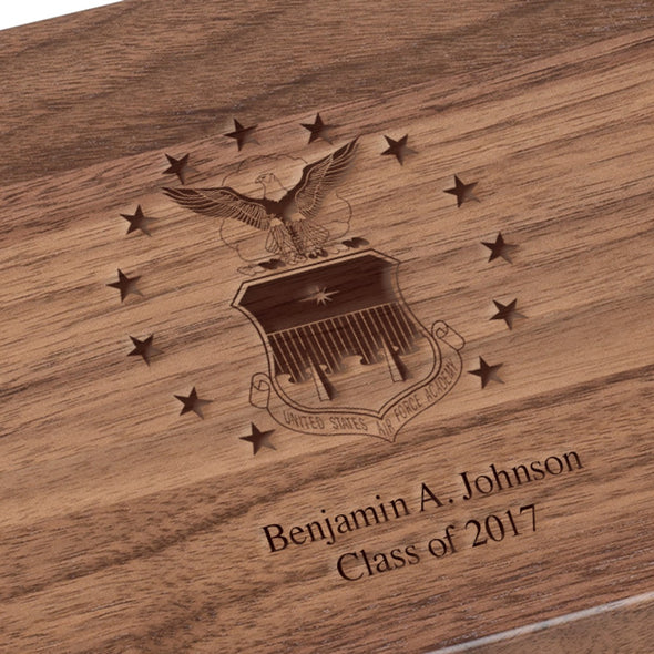 Our beautiful solid walnut desk box is made from hand-selected domestic walnut and crafted in the USA. Each box is hand finished with care, and proudly displays the Air Force Academy Logo on the lid.