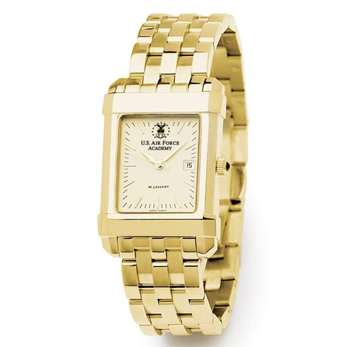 US Air Force Academy men's gold watch featuring the Air Force Academy Logo on cream dial. Free Engraving on all watches.