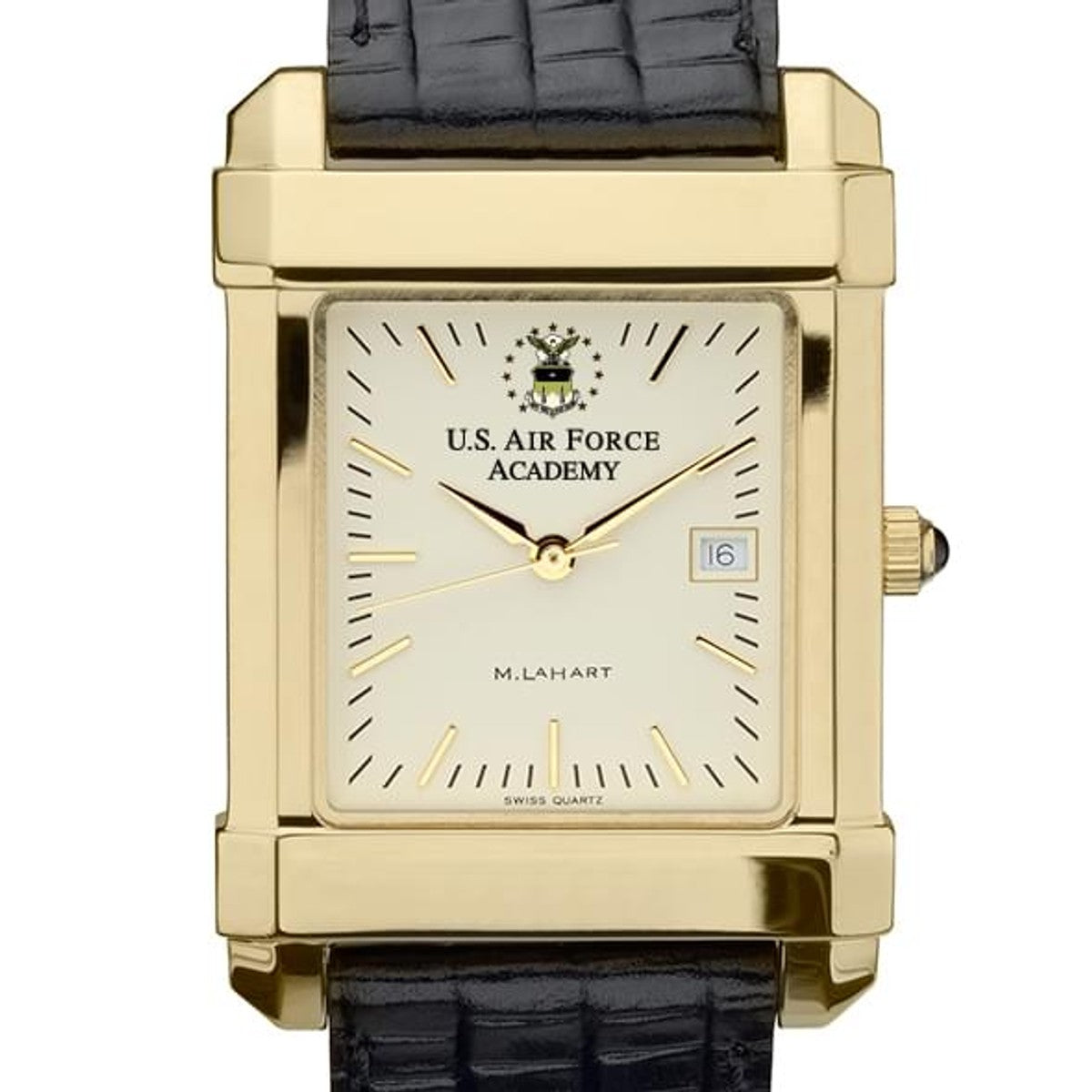 US Air Force Academy men's gold watch featuring the Air Force Academy Logo on cream dial. Free Engraving on all watches.