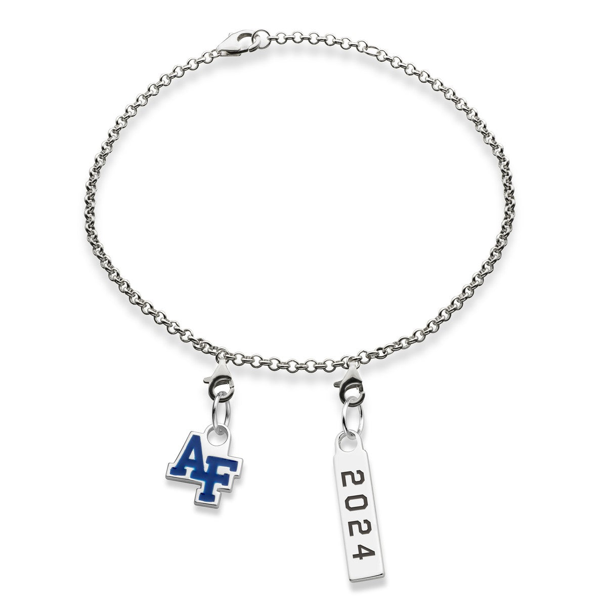 Our spirited US Air Force Academy sterling silver anklet is the perfect way to show your school pride. This eye-catching anklet is adorned with two sterling silver charms, one featuring the school logo in colored enamel, the other with the graduation year.