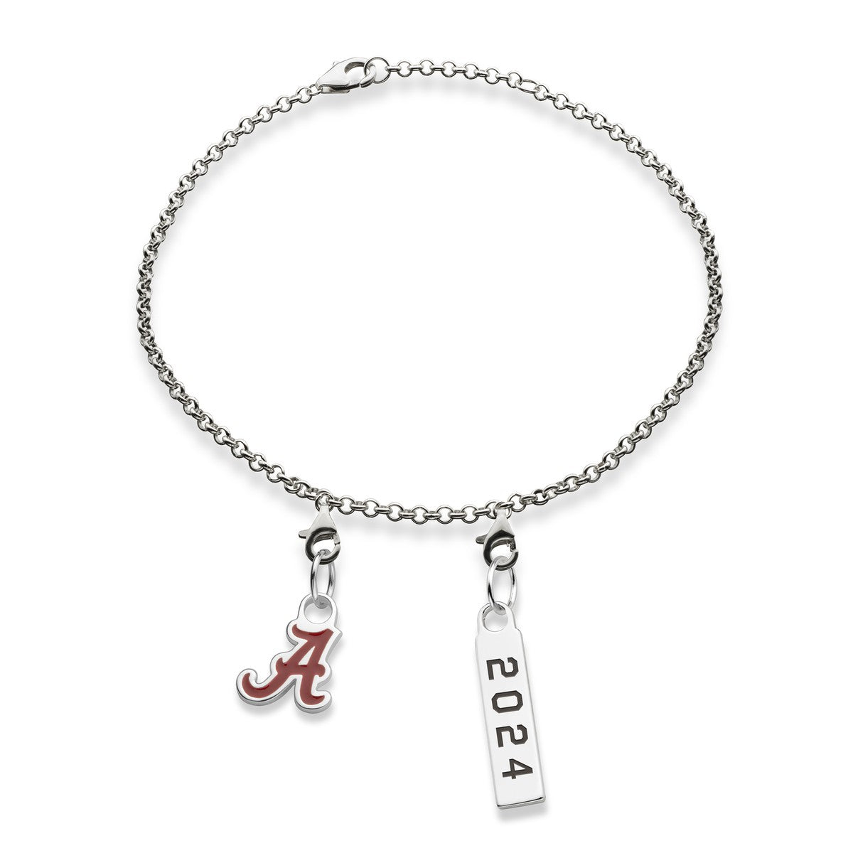 Our spirited University of Alabama sterling silver anklet is the perfect way to show your school pride. This eye-catching anklet is adorned with two sterling silver charms, one featuring the school logo in colored enamel, the other with the graduation year.