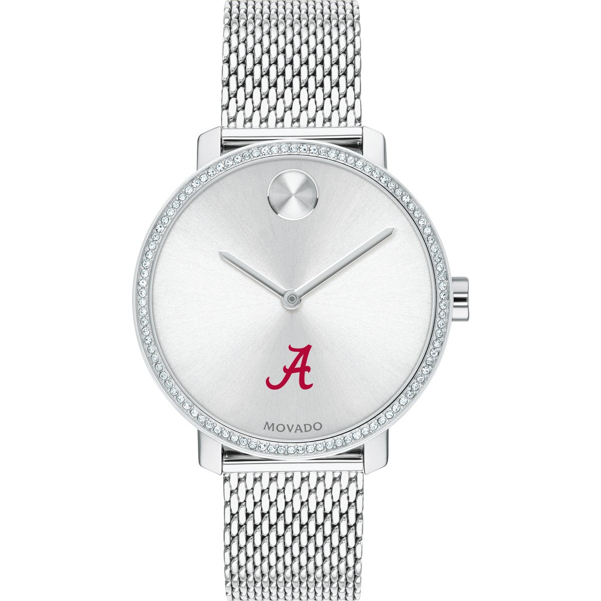 University of Alabama Women's Movado BOLD watch features the Alabama Logo in full color at 6 o'clock on silver sunray dial.