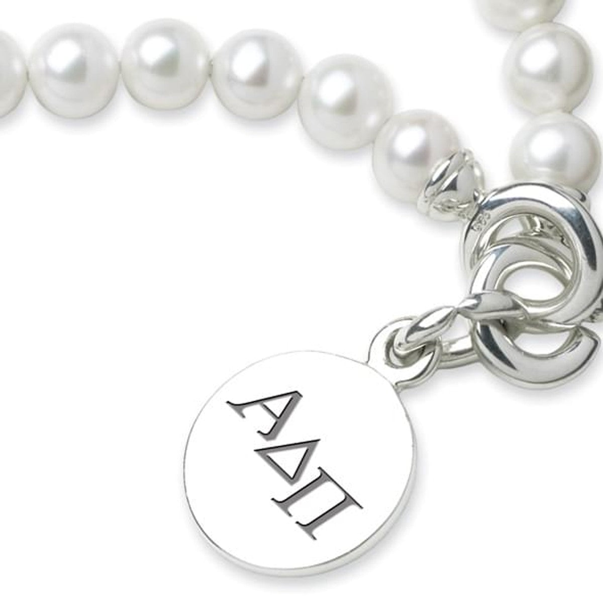 Alpha Delta Pi pearl bracelet and sterling silver Alpha Delta Pi charm features ADPi letters delicately engraved on front and interlocking "C" clasp.