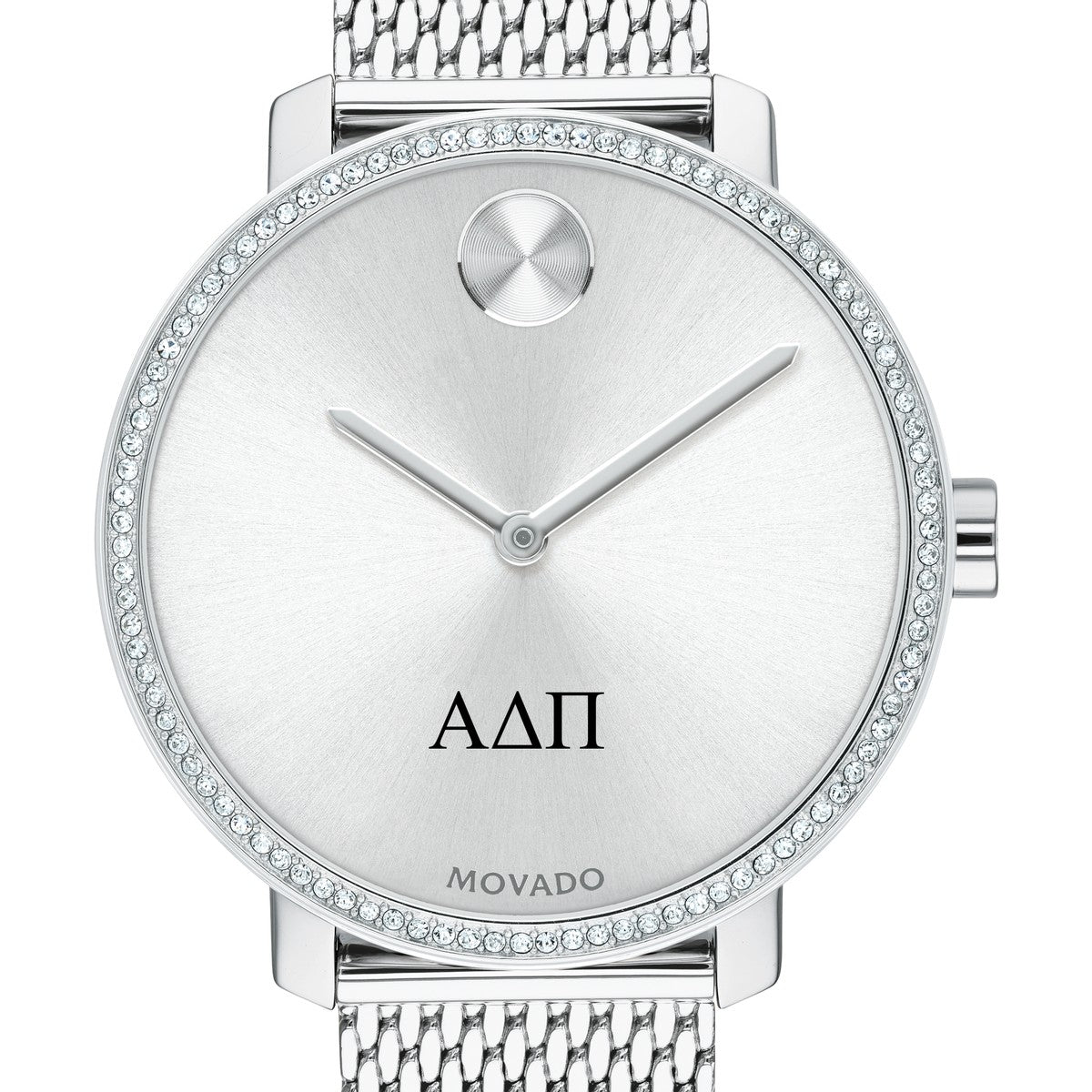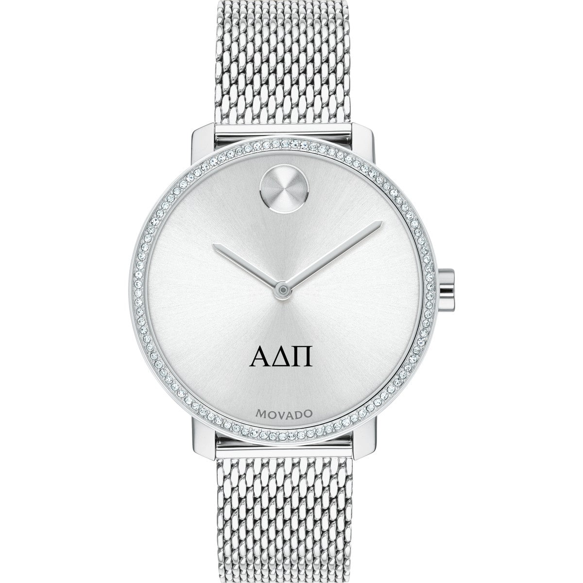 Alpha Delta Pi Women's Movado BOLD watch features the Alpha Delta Pi Logo in full color at 6 o'clock on silver sunray dial.