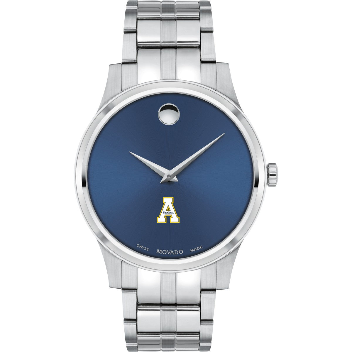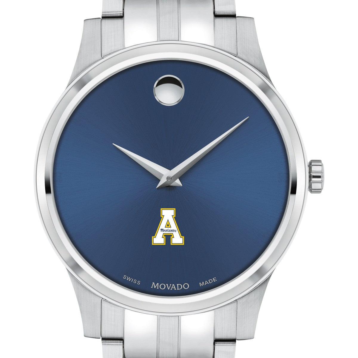 The Appalachian State University Men's Movado Collection watch boasts a striking blue dial featuring the iconic Appalachian State Logo in full color. This timeless timepiece, renowned for its concave dot representing the sun at high noon, has been a symbol of elegance since its inception in 1947. Make it uniquely yours with free engraving without affecting order processing time.