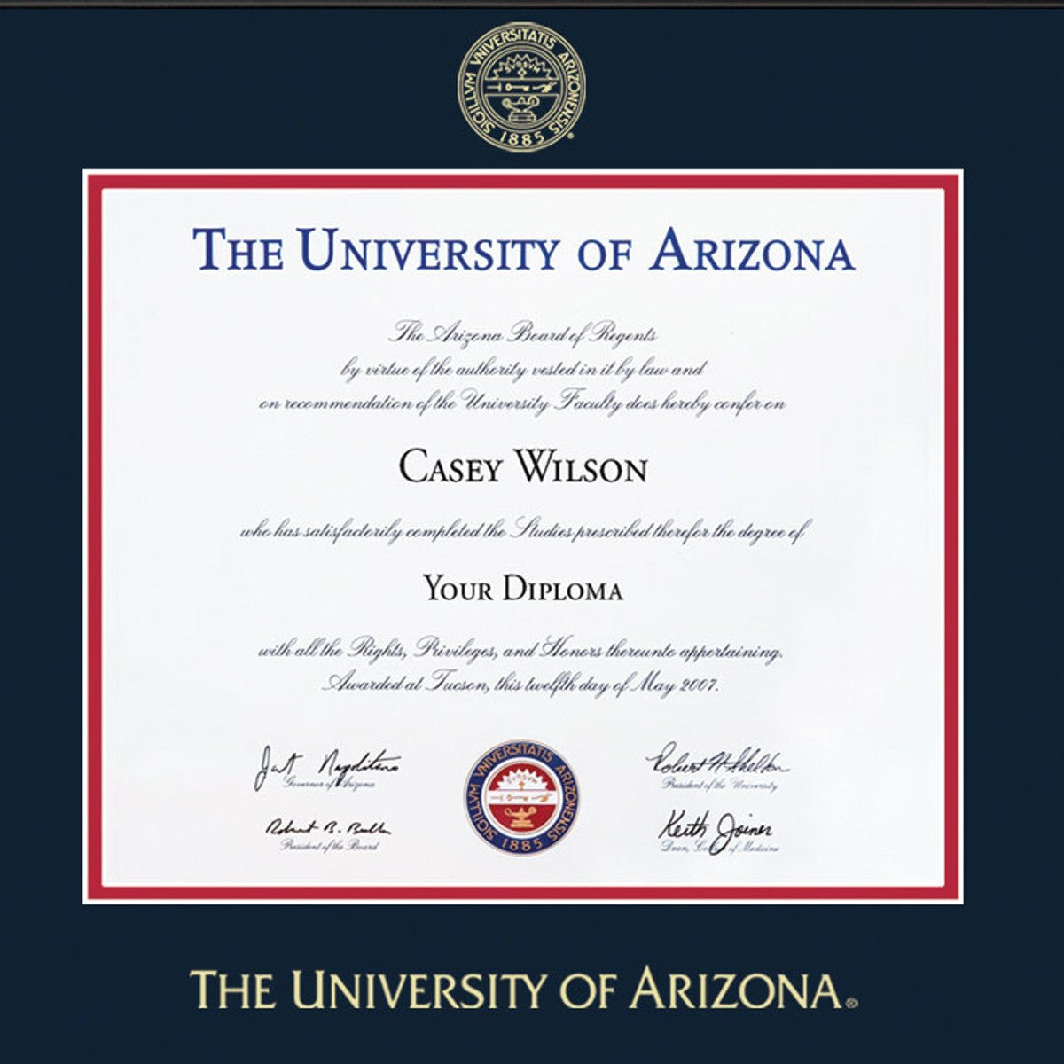 This University of Arizona diploma frame is crafted from solid wood in the USA. Proudly display your Arizona diploma with museum quality conservation mounting materials to showcase and protect your University of Arizona diploma.