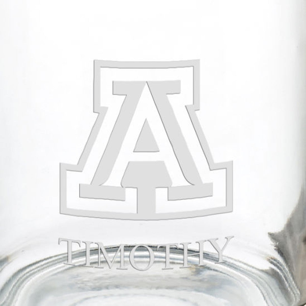 The Arizona glass coffee mug is deep-etched with the University of Arizona logo. Generously proportioned 13 oz glasses are a pleasure to hold. Your name can be added under the logo for free.