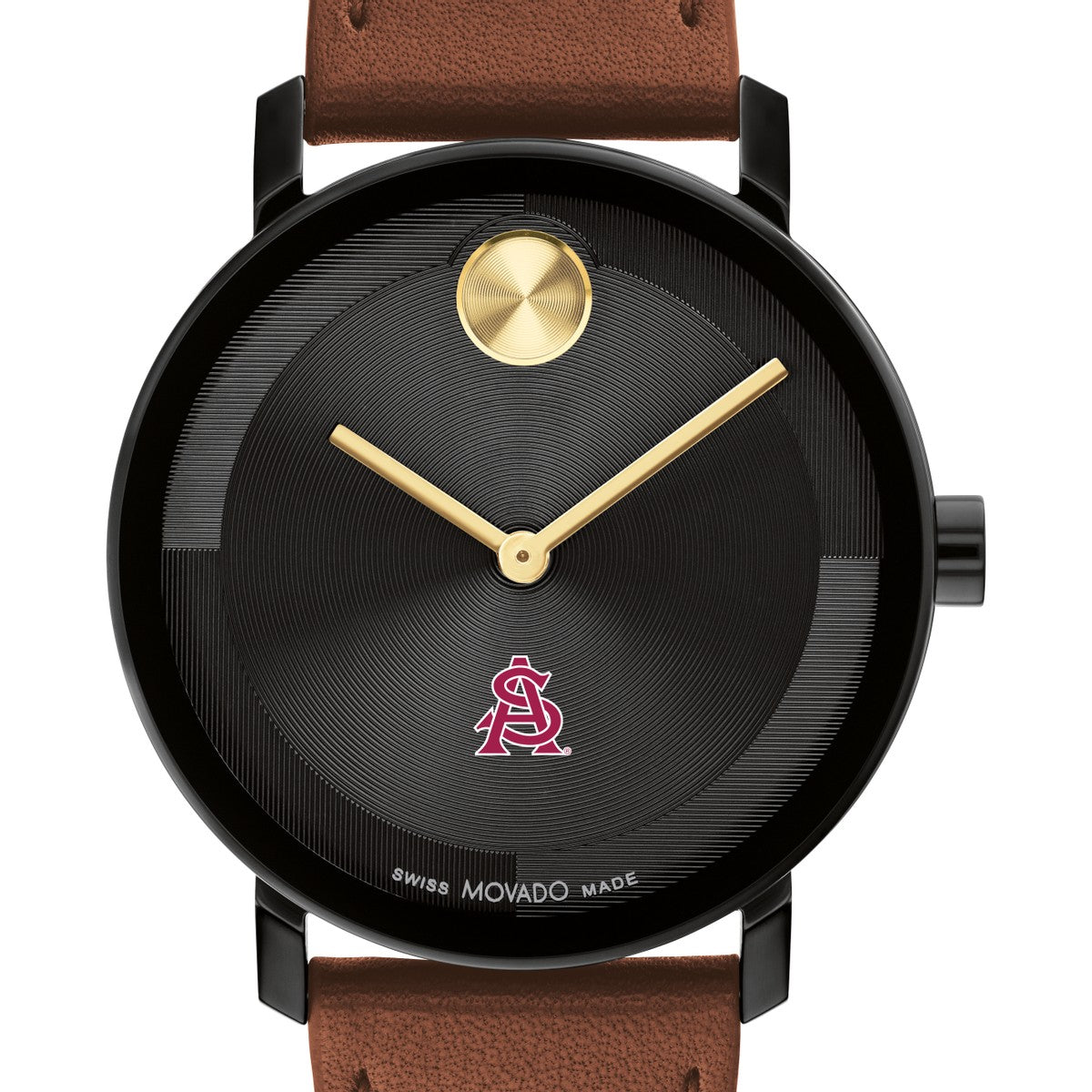 Embrace timeless sophistication with the Arizona State Men's Movado watch, featuring ASU Logo on the dial. Crafted with a luxurious Cognac Nappa leather strap and a striking micro-textured black tonal dial with a glossy lacquer overlay. Complimentary personal engraving.