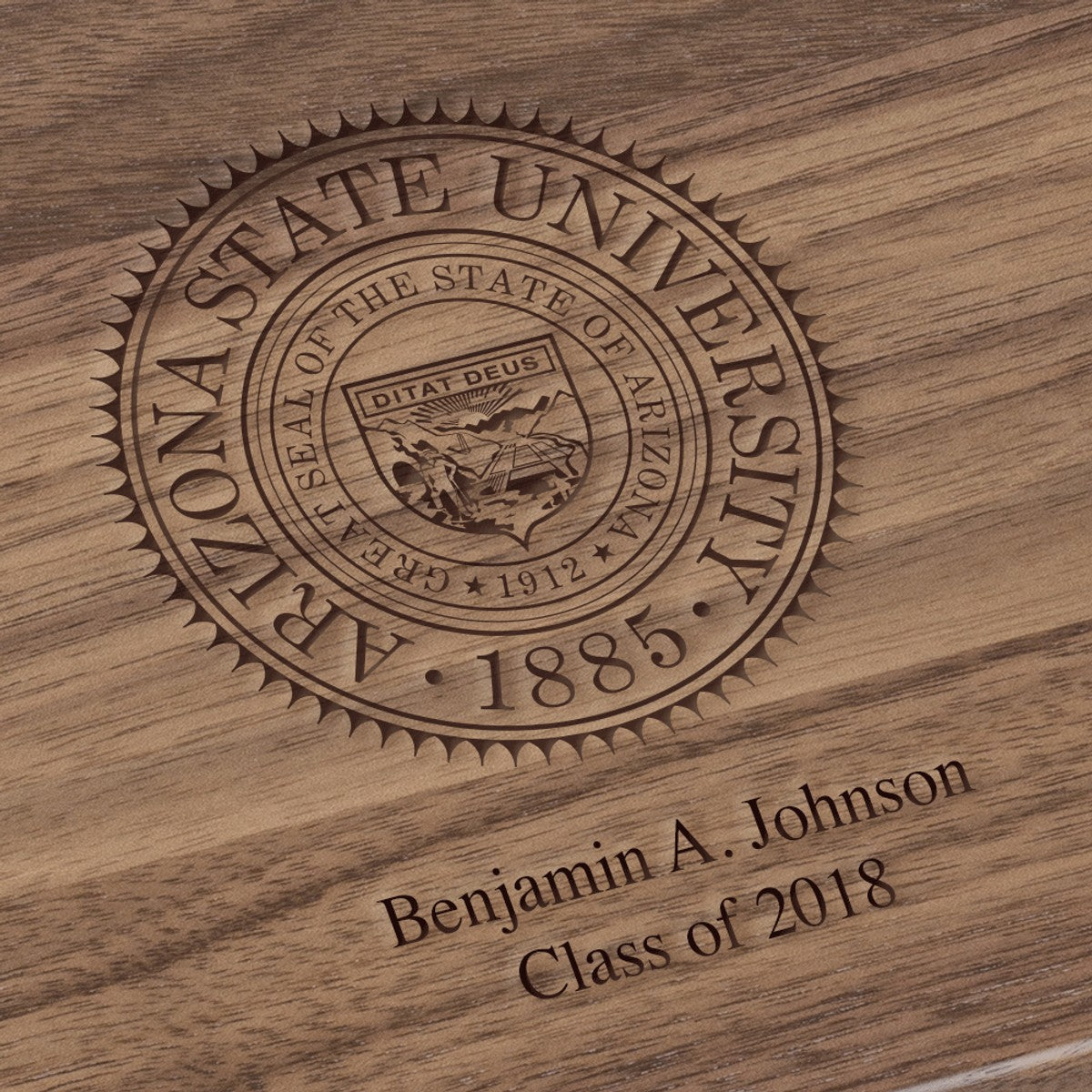 Our beautiful solid walnut desk box is made from hand-selected domestic walnut and crafted in the USA. Each box is hand finished with care, and proudly displays the ASU Logo on the lid.