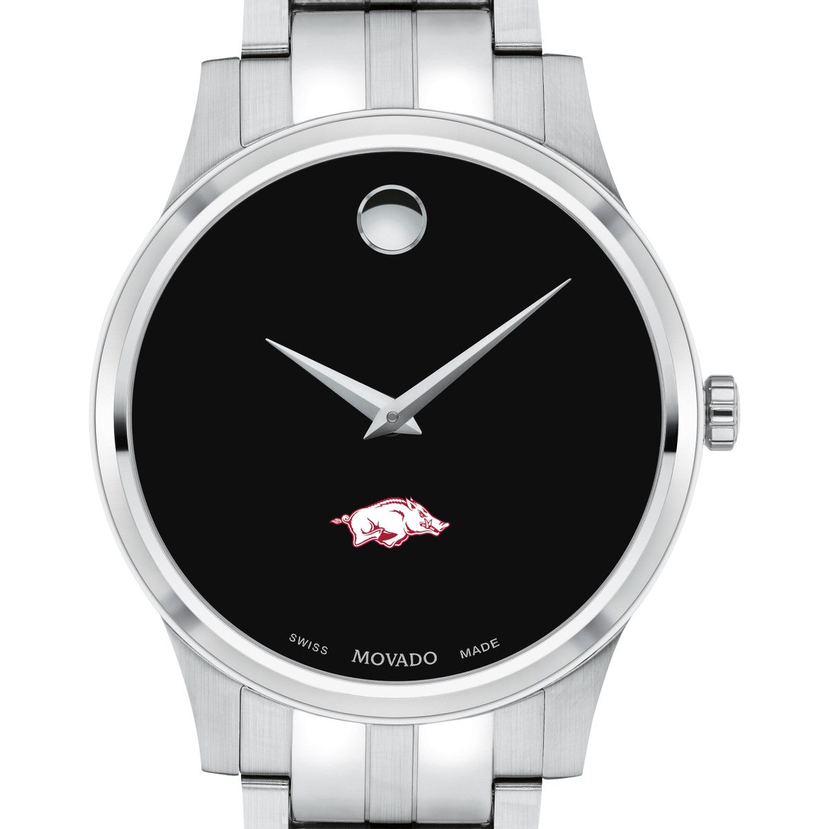 The University of Arkansas Men's Movado Collection watch showcases the iconic Arkansas logo in full color on a sophisticated black dial. This classic timepiece, featuring the renowned concave dot symbolizing the sun at high noon, has been a design masterpiece since its creation in 1947. Personalize your watch with free engraving without any delay to your order.