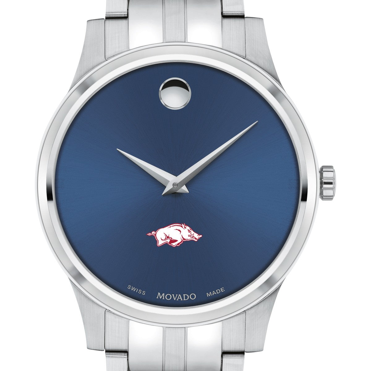 The University of Arkansas Men's Movado Collection watch boasts a striking blue dial featuring the iconic Arkansas logo in full color. This timeless timepiece, renowned for its concave dot representing the sun at high noon, has been a symbol of elegance since its inception in 1947. Make it uniquely yours with free engraving without affecting order processing time.