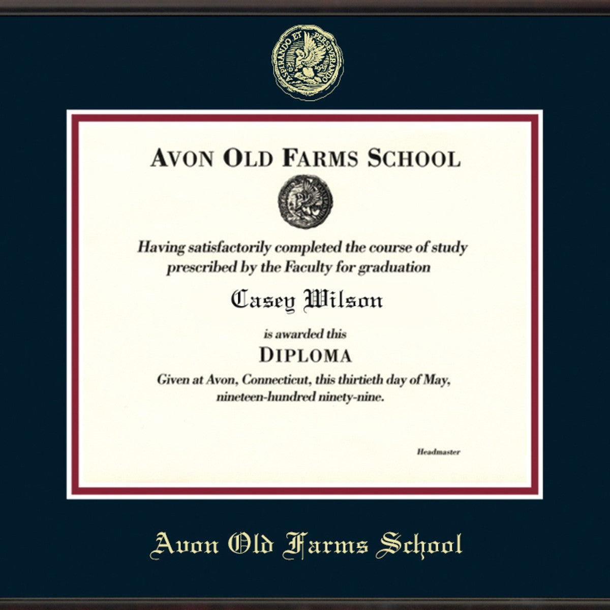 This Avon Old Farms diploma frame is crafted from solid wood in the USA. Proudly display your AOF diploma with museum quality conservation mounting materials to showcase and protect your Avon Old Farms diploma.