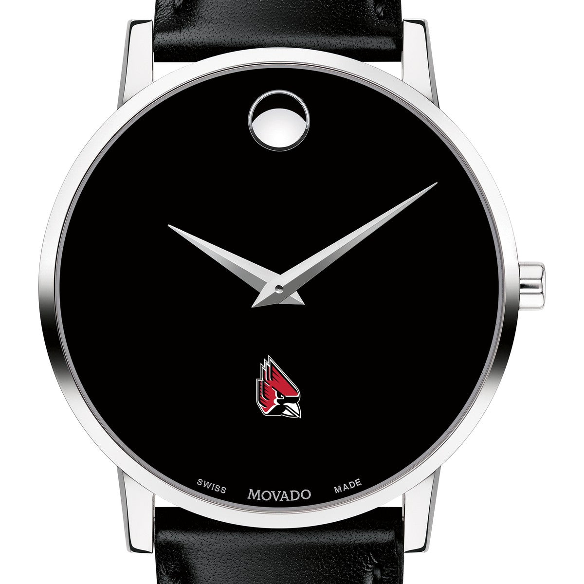 Ball State University Men's Movado Museum watch features the Ball State logo in full color at 6 o'clock on black dial. Created in 1947, the iconic concave dot symbolizes the sun at high-noon. Complimentary personal engraving.
