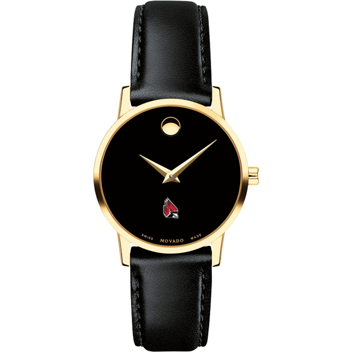Ball State University Women's Movado Museum watch features the Ball State logo in full color at 6 o'clock on black dial. Created in 1947, the iconic concave dot symbolizes the sun at high-noon. Complimentary personal engraving.