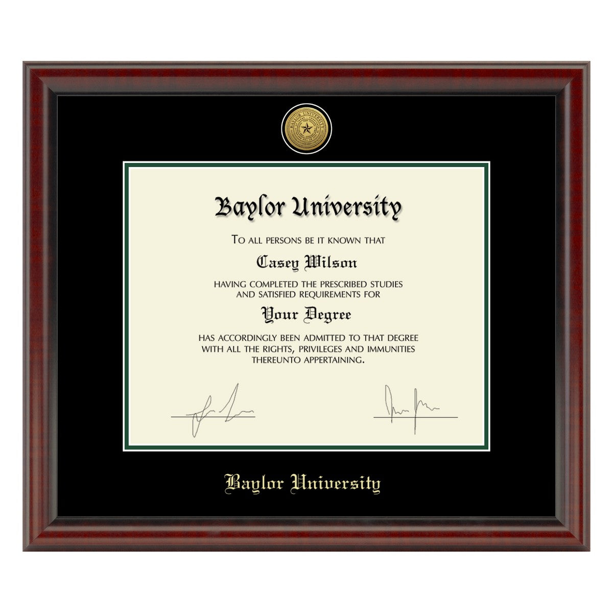Highlighted by the gold medallion above the Baylor University diploma, this frame is sure to stand out in your home or office. Crafted in the USA of the finest hardwood with museum quality conservation mounting materials to showcase and protect your diploma.