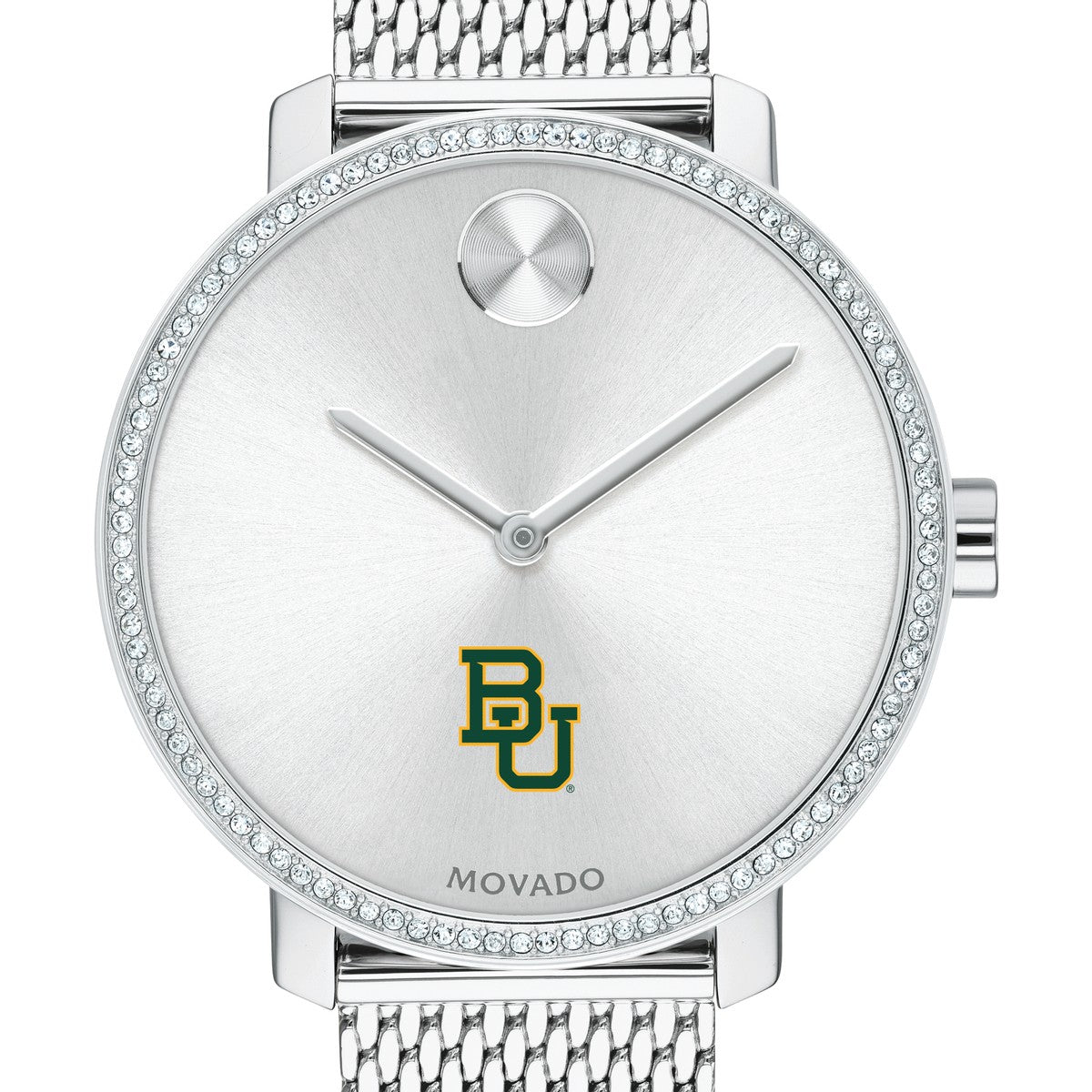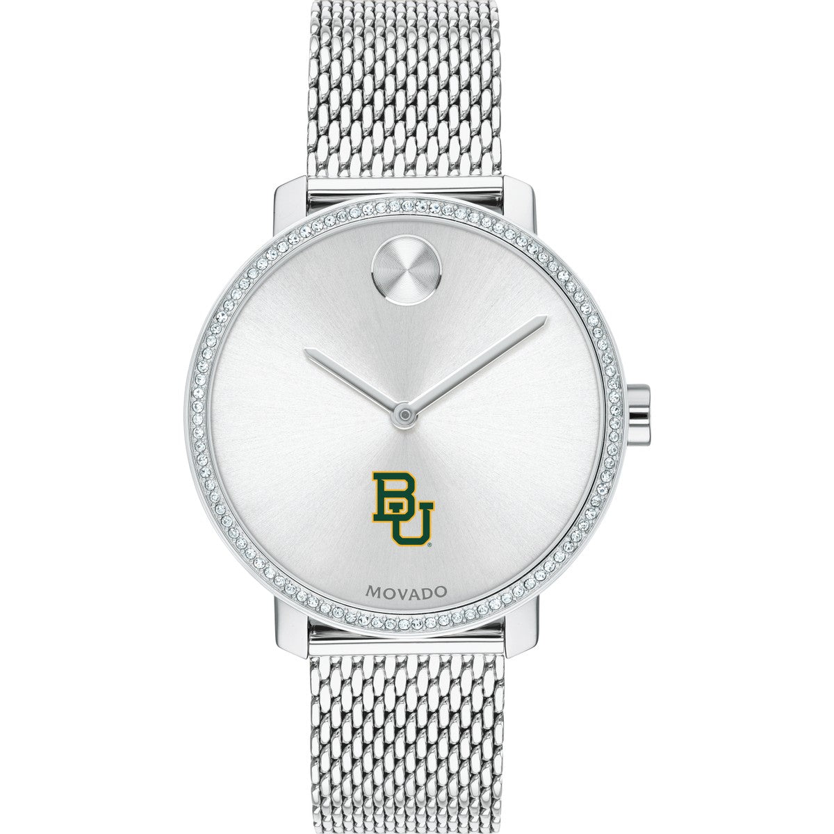 Baylor University Women's Movado BOLD watch features the Baylor Logo in full color at 6 o'clock on silver sunray dial.