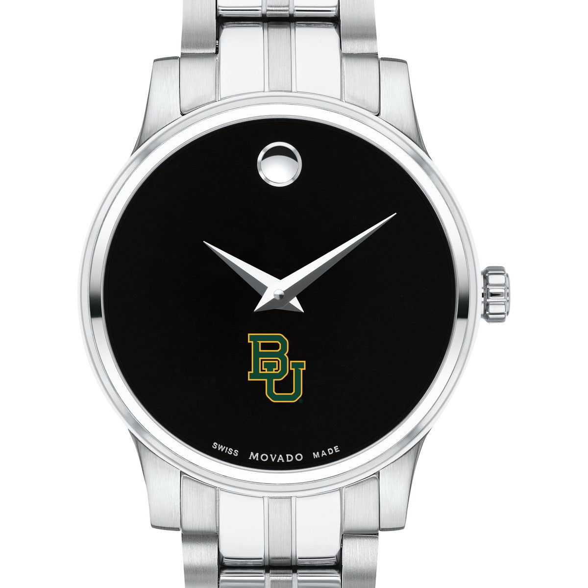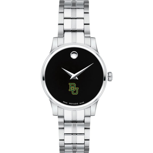 The Baylor University Women's Movado Collection watch showcases the iconic Baylor Logo in full color against a sophisticated black dial. This elegant timepiece, featuring the renowned concave dot symbolizing the sun at high noon, embodies timeless style. Personalize your watch with free engraving without any delay to your order.