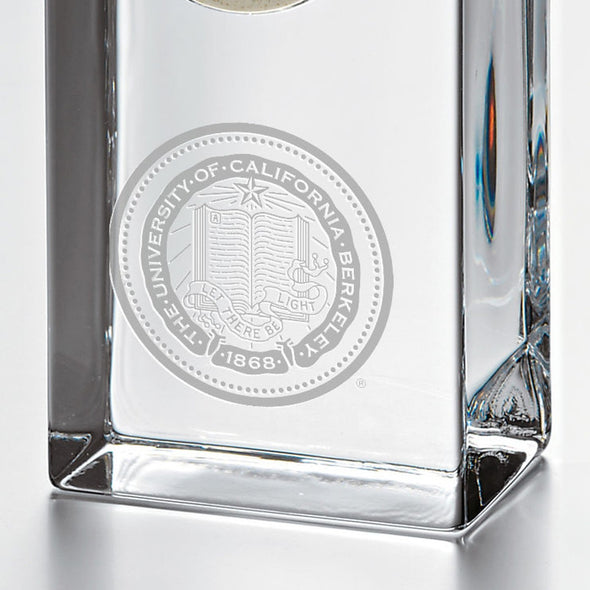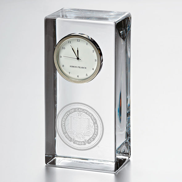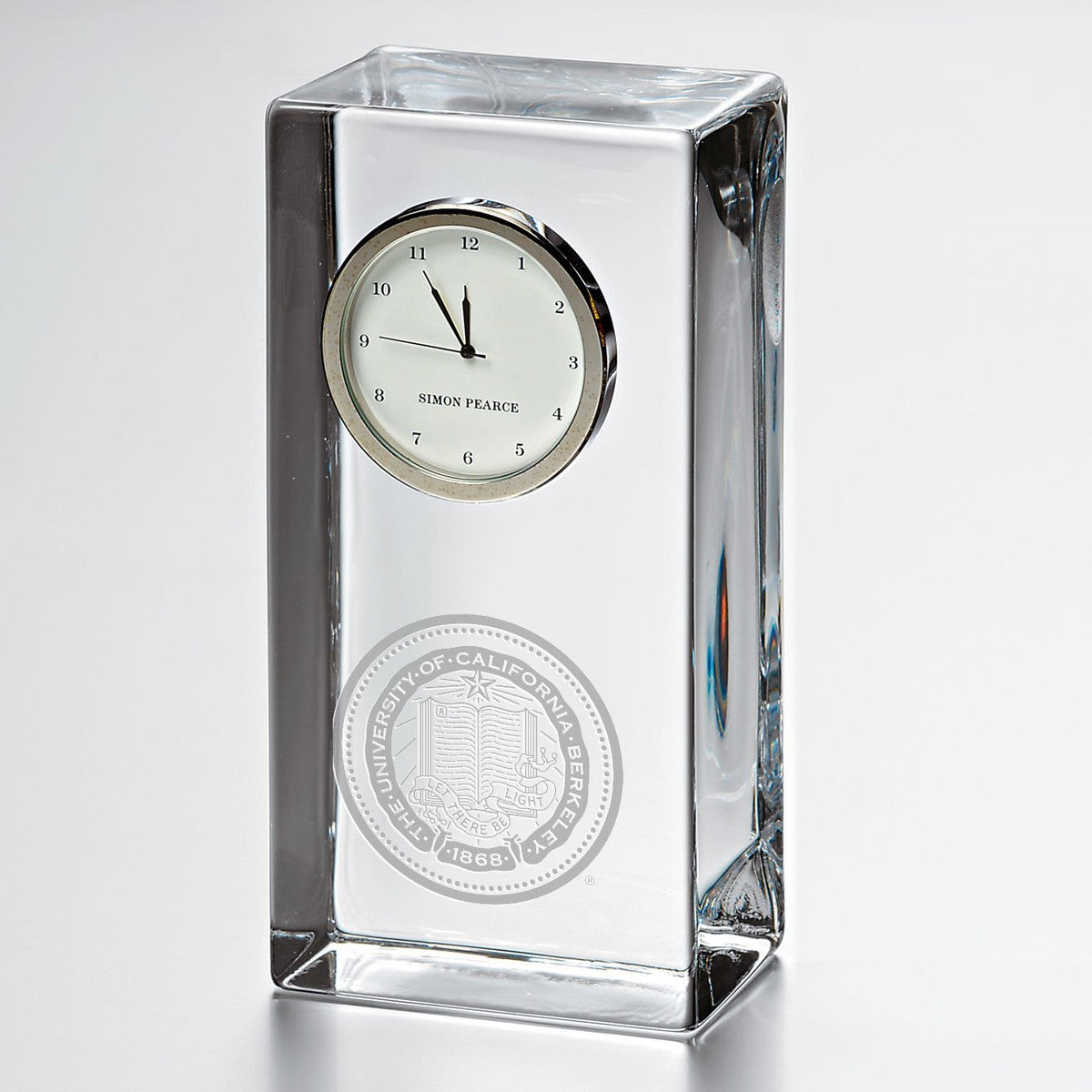 The Berkeley Tall Glass Desk Clock stands proudly on any surface, distinctly etched with the Cal Logo. The clock showcases a traditional numbered face with a sweep hand to count the seconds.