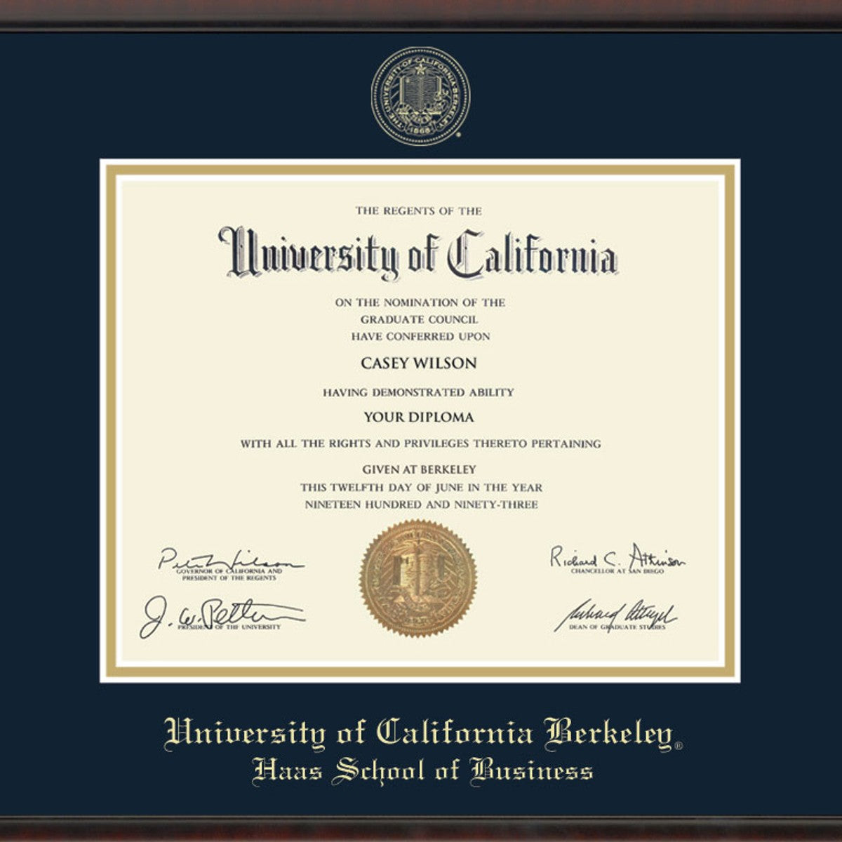 This Haas School of Business diploma frame is crafted from solid wood in the USA. Proudly display your Berkeley Haas diploma with museum quality conservation mounting materials to showcase and protect your Haas School of Business diploma.