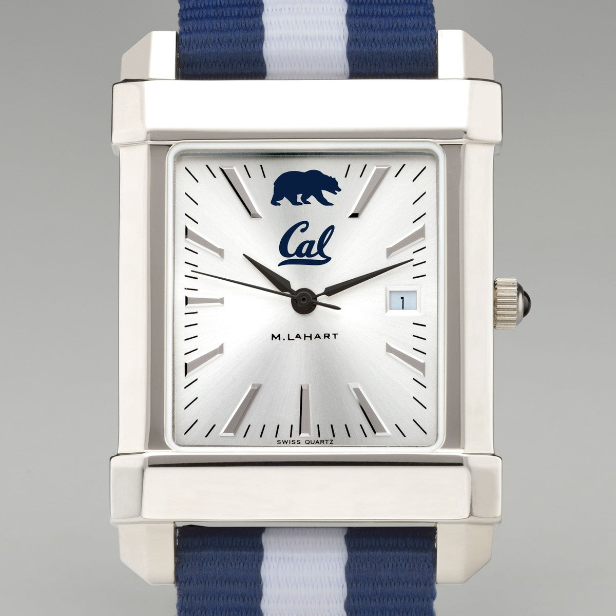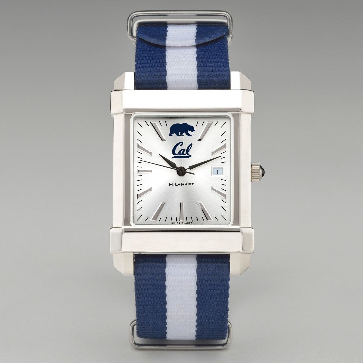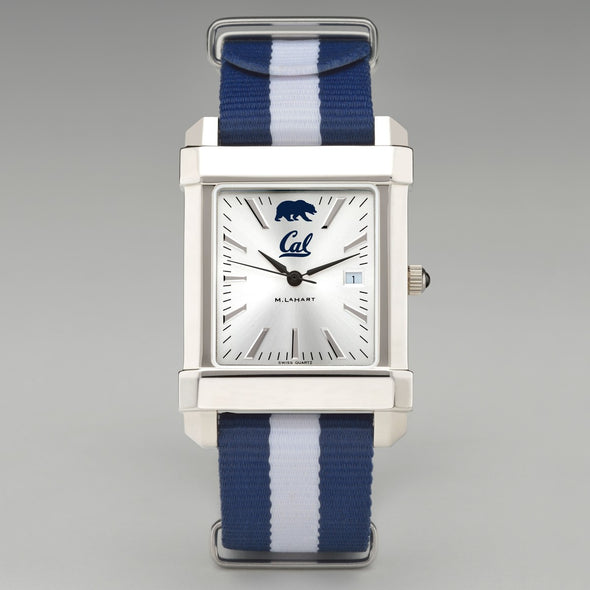 This Berkeley original features the Cal Logo on our sophisticated new dial with a sunray brushed metallic finish. The RAF Nylon strap popularized by James Bond now features your school colors for the first time. Free personalization available on the back of the watch with initials and graduation year.