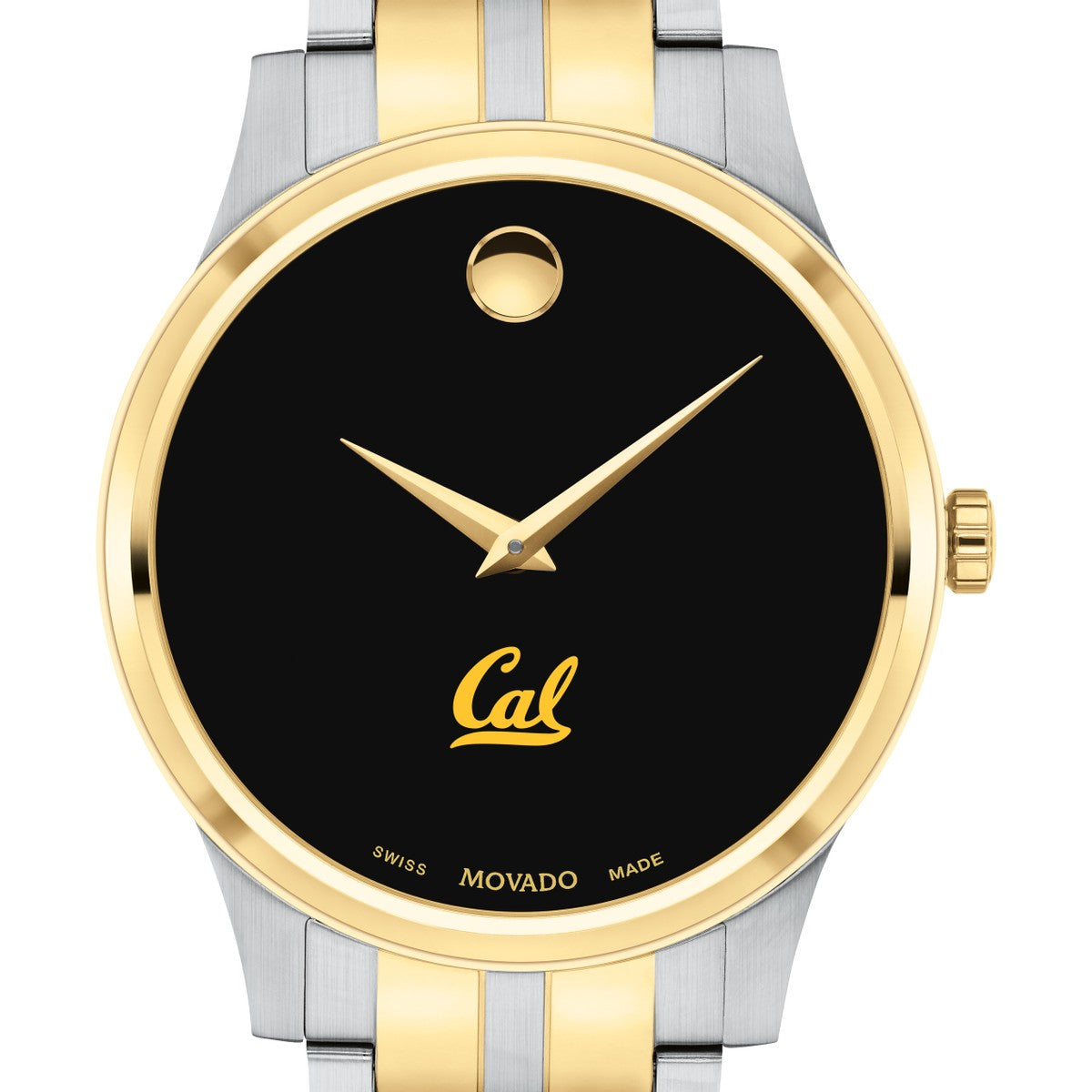 The Berkeley Men's Movado Collection watch showcases the iconic Cal Logo in full color on a sophisticated black dial. This classic timepiece, featuring the renowned concave dot symbolizing the sun at high noon, has been a design masterpiece since its creation in 1947. Personalize your watch with free engraving without any delay to your order.