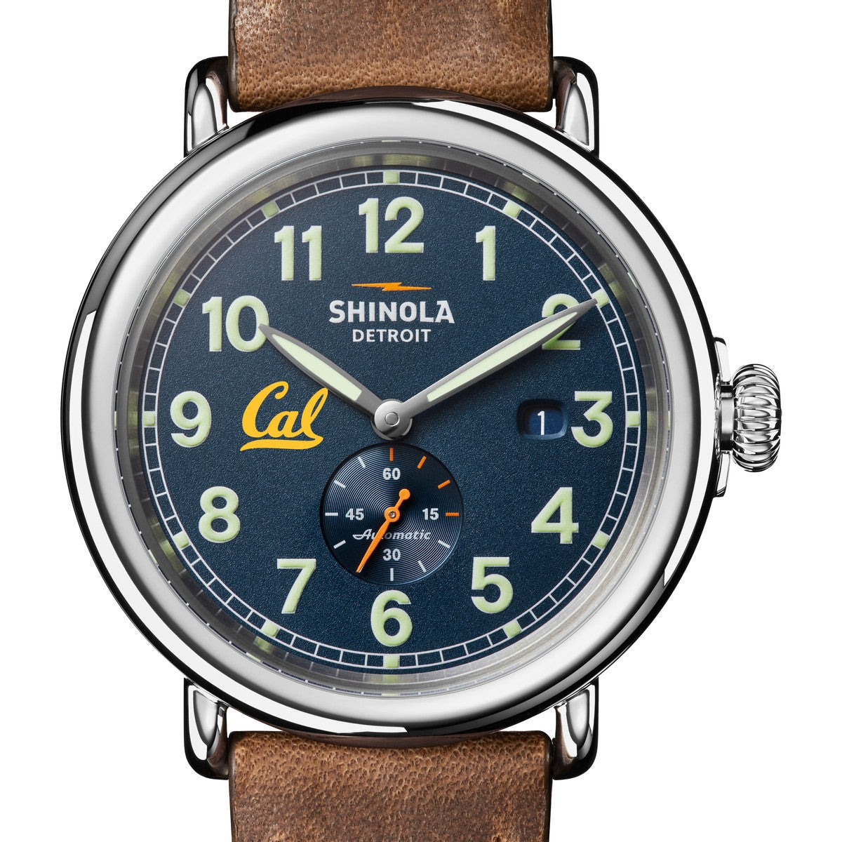 The Shinola Runwell features the Cal Logo in full color on the midnight blue dial with a 45 mm case. Every detail of Shinola's timepiece has been engineered with an obsessive focus to ensure it can be worn any way but it can't be worn out. Complimentary personal engraving