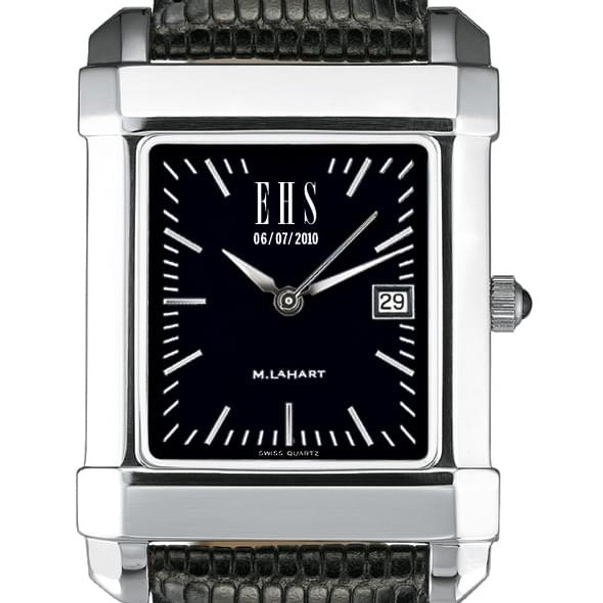 Strong and durable, the Men's custom steel Quad watch includes your personalization on a black dial. The simple look is completed with a soft black leather band.