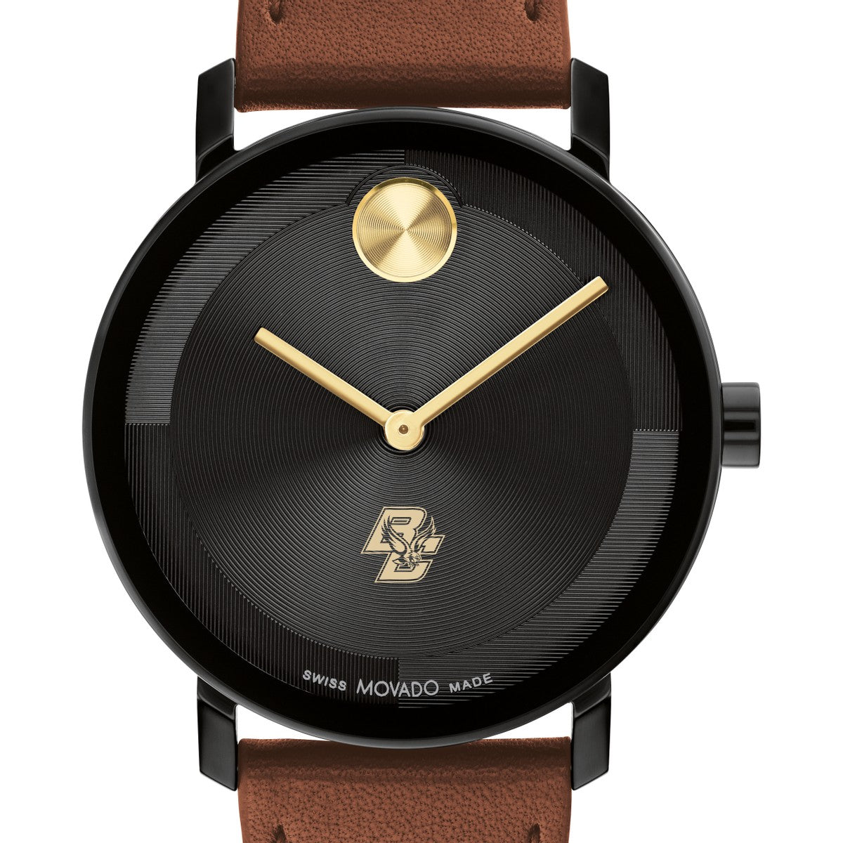 Embrace timeless sophistication with the Boston College Men's Movado watch, featuring Boston College Logo on the dial. Crafted with a luxurious Cognac Nappa leather strap and a striking micro-textured black tonal dial with a glossy lacquer overlay. Complimentary personal engraving.