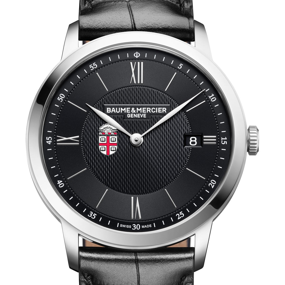 Bold and refined, the Brown Men's Baume & Mercier 40mm Classima Watch features a deep black dial with the Brown logo, polished steel hands, and a classic leather strap. Powered by a precision quartz movement, it’s a sleek statement of sophistication for those who value excellence and enduring style. Complimentary personal engraving.