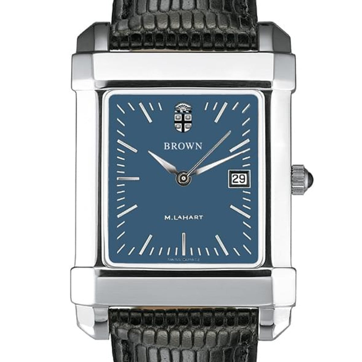Brown University men's steel watch featuring Brown seal at 12 o'clock and "Brown" inscribed below on blue dial.