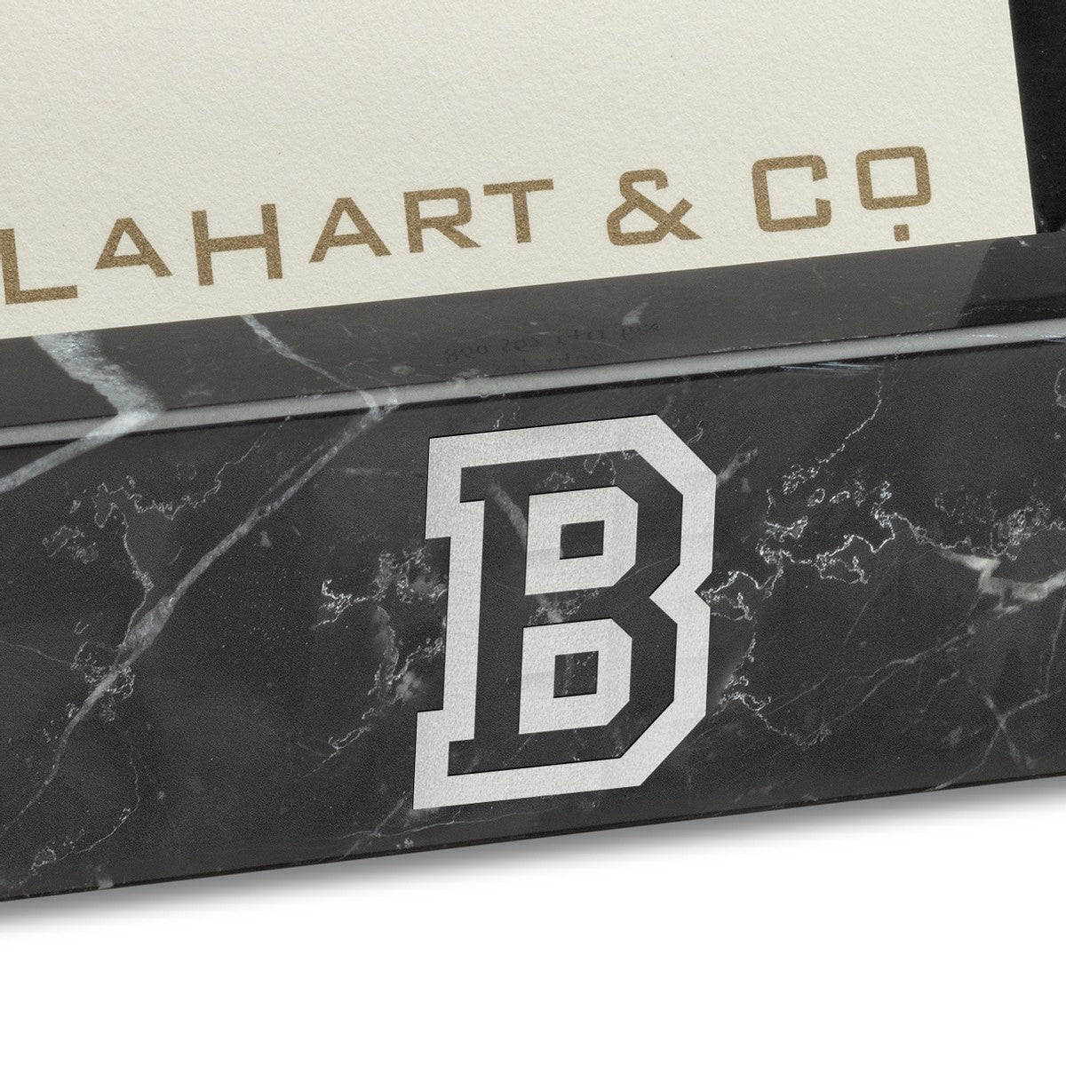 Perfect for new grads and seasoned professionals, the officially licensed Bucknell University marble cardholder is an essential for the desk of Bucknell fans. The Bucknell Logo is elegantly featured on the front of this substantial, solid marble card holder and accommodates all standard size business cards.