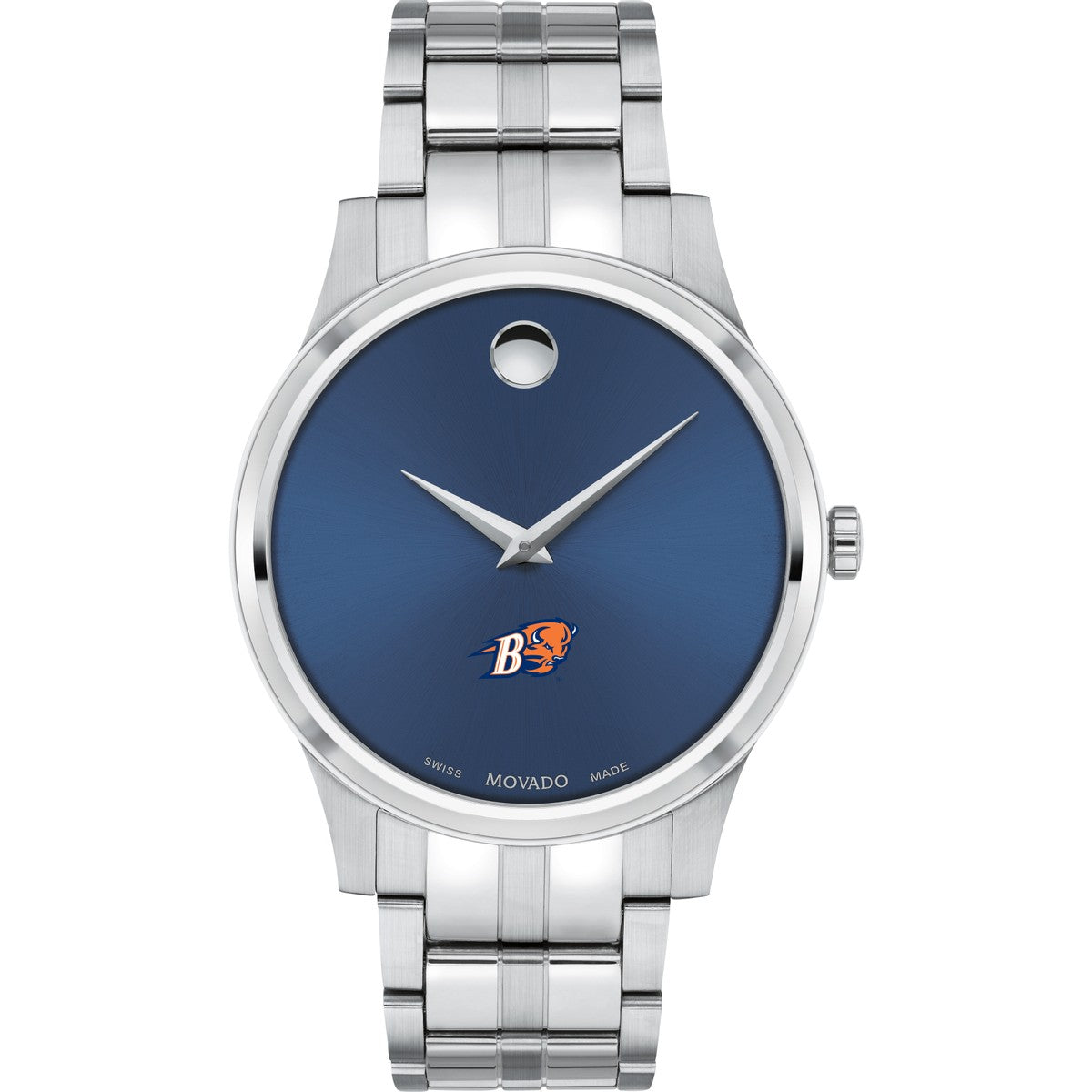 The Bucknell University Men's Movado Collection watch boasts a striking blue dial featuring the iconic Bucknell Logo in full color. This timeless timepiece, renowned for its concave dot representing the sun at high noon, has been a symbol of elegance since its inception in 1947. Make it uniquely yours with free engraving without affecting order processing time.