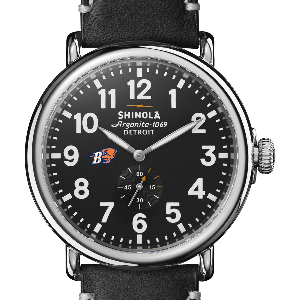 The Shinola Runwell features the Bucknell Logo in color on the black dial with a large 47 mm case. Every detail of Shinola's flagship timepiece has been engineered with an obsessive focus to ensure it can be worn any way but it can't be worn out. Complimentary personal engraving