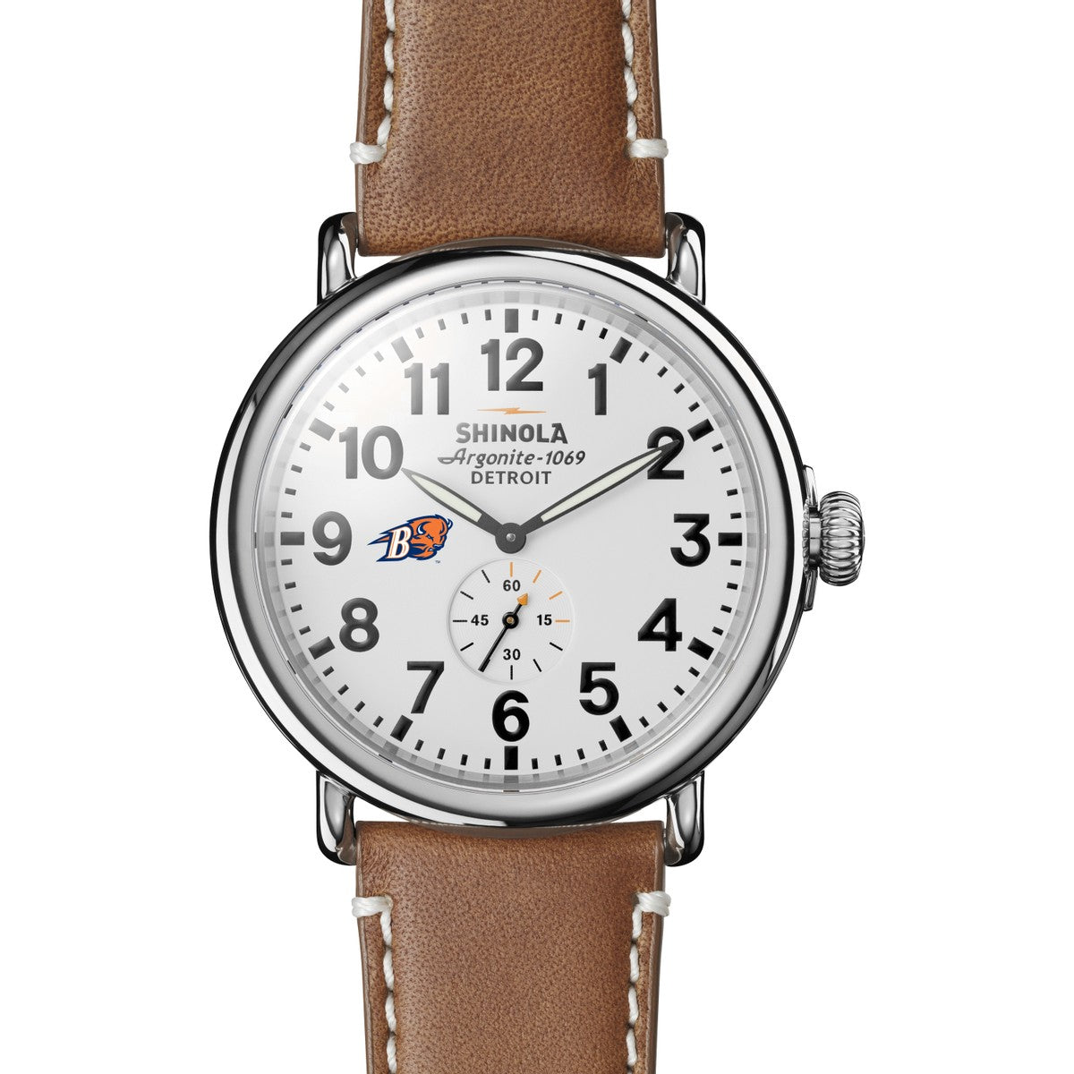 The Shinola Runwell features the Bucknell Logo in full color on the white dial with a large 47 mm case. Every detail of Shinola's flagship timepiece has been engineered with an obsessive focus to ensure it can be worn any way but it can't be worn out. Complimentary personal engraving