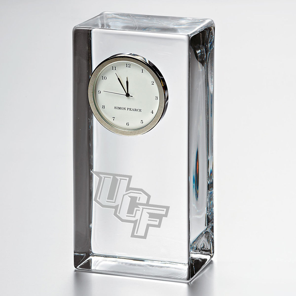 The UCF Tall Glass Desk Clock stands proudly on any surface, distinctly etched with the UCF Logo. The clock showcases a traditional numbered face with a sweep hand to count the seconds.