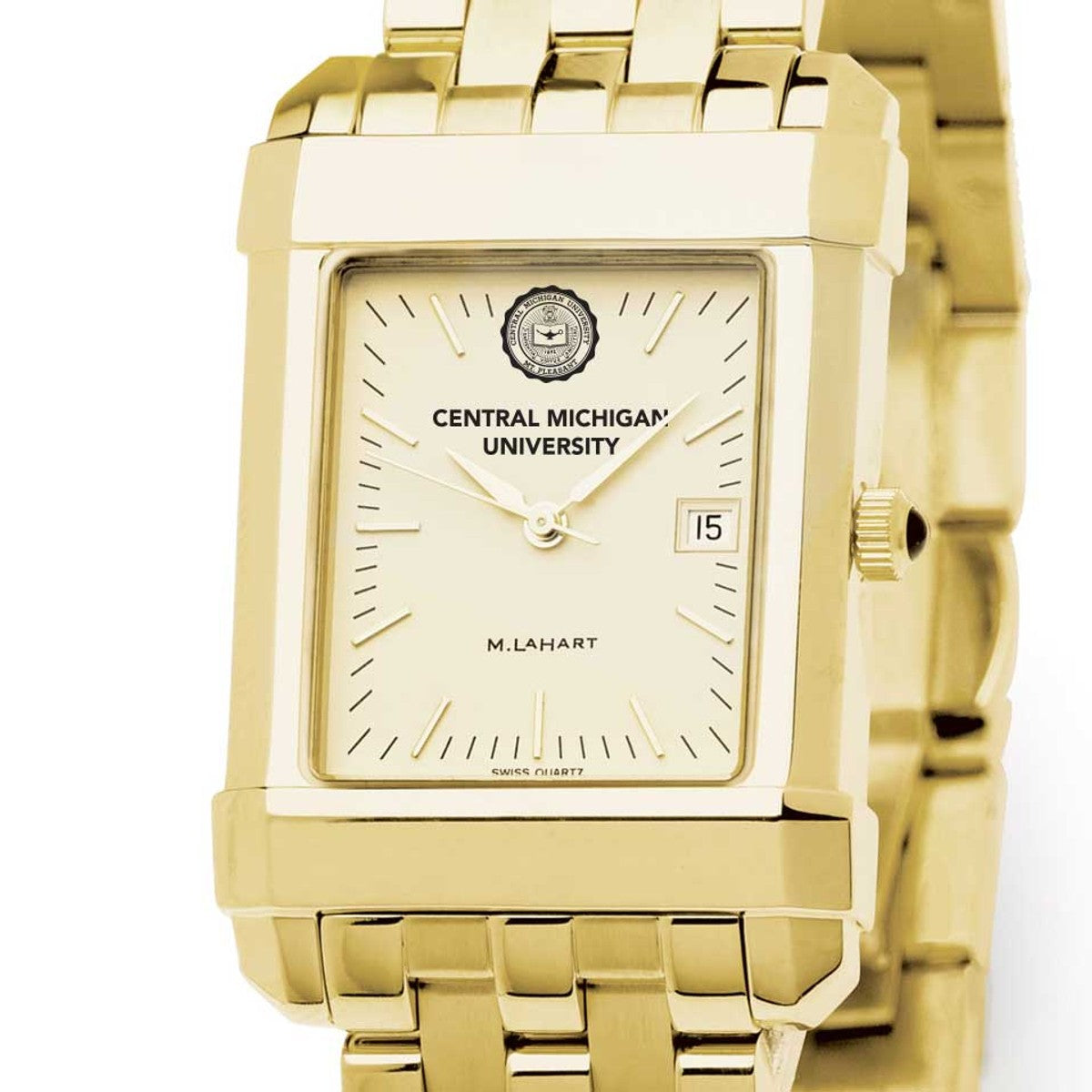 Central Michigan University men's gold watch featuring the Central Michigan logo on cream dial. Free Engraving on all watches.