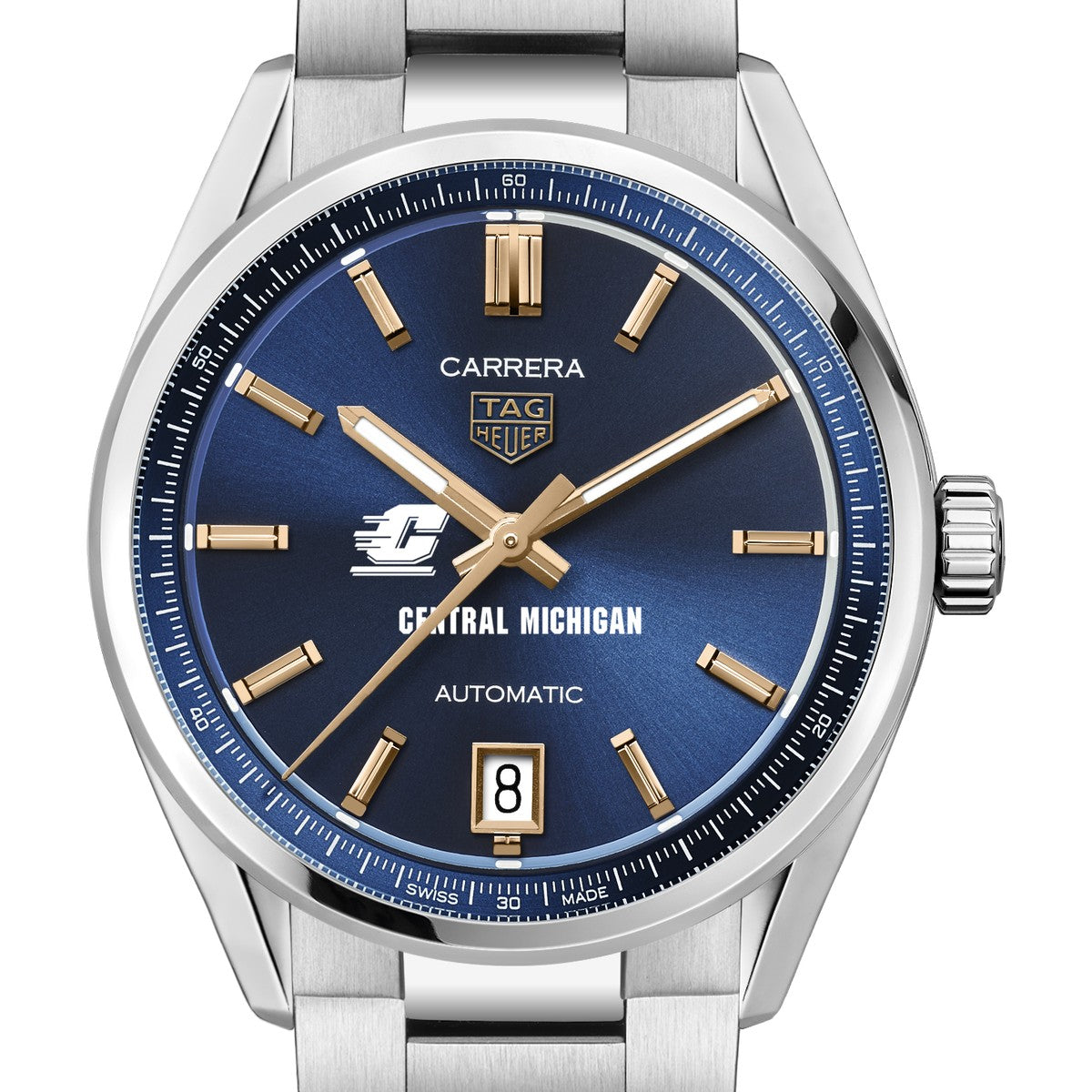 Discover the Central Michigan Women's TAG Heuer Steel Carrera watch, showcasing the Central Michigan logo on a deep-blue sunray brushed dial with 18K 5N rose gold-plated hands and indexes. Powered by the Calibre 7 movement, this timepiece is designed for precision and excellence. Complimentary personal engraving.