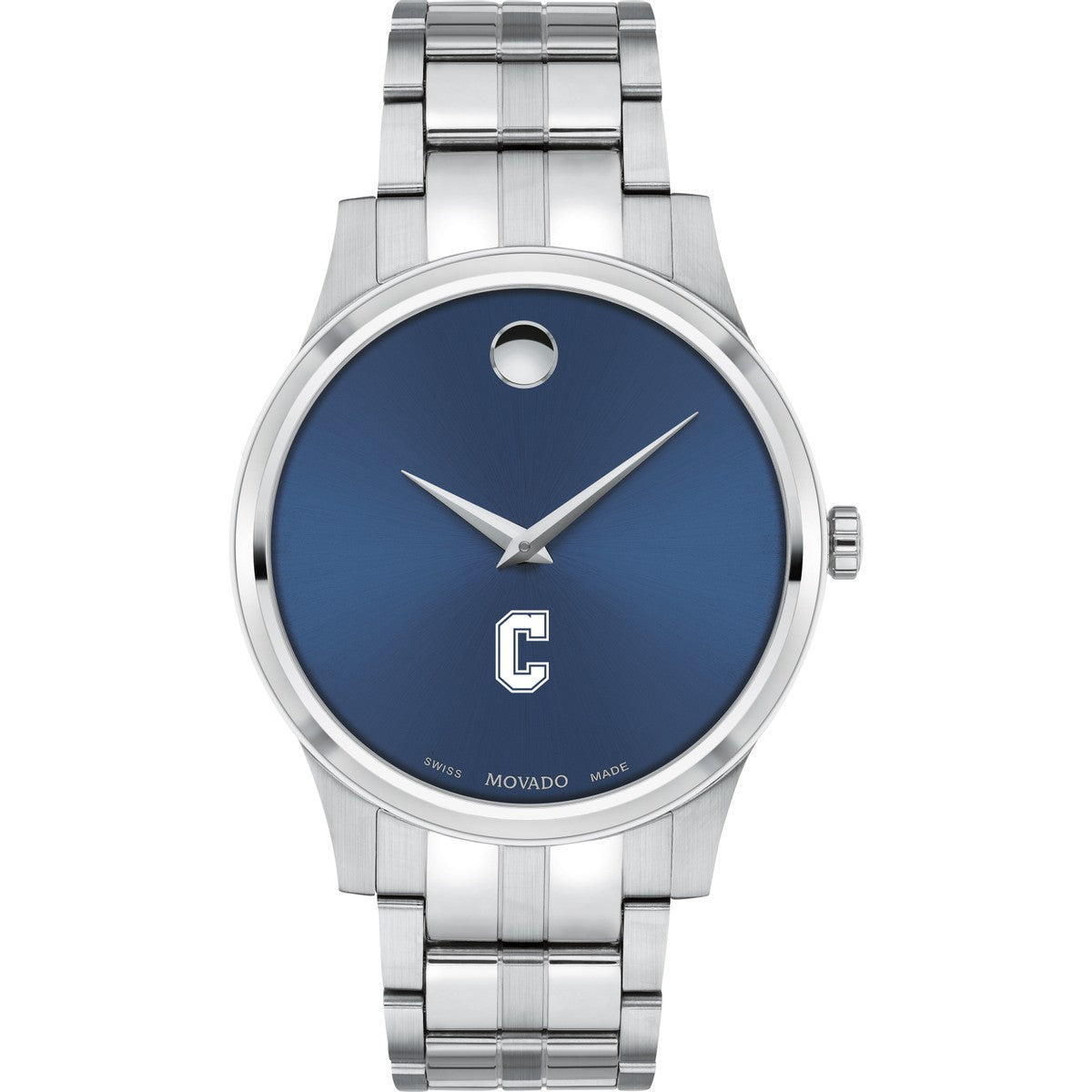 The College of Charleston Men's Movado Collection watch boasts a striking blue dial featuring the iconic Charleston logo in full color. This timeless timepiece, renowned for its concave dot representing the sun at high noon, has been a symbol of elegance since its inception in 1947. Make it uniquely yours with free engraving without affecting order processing time.