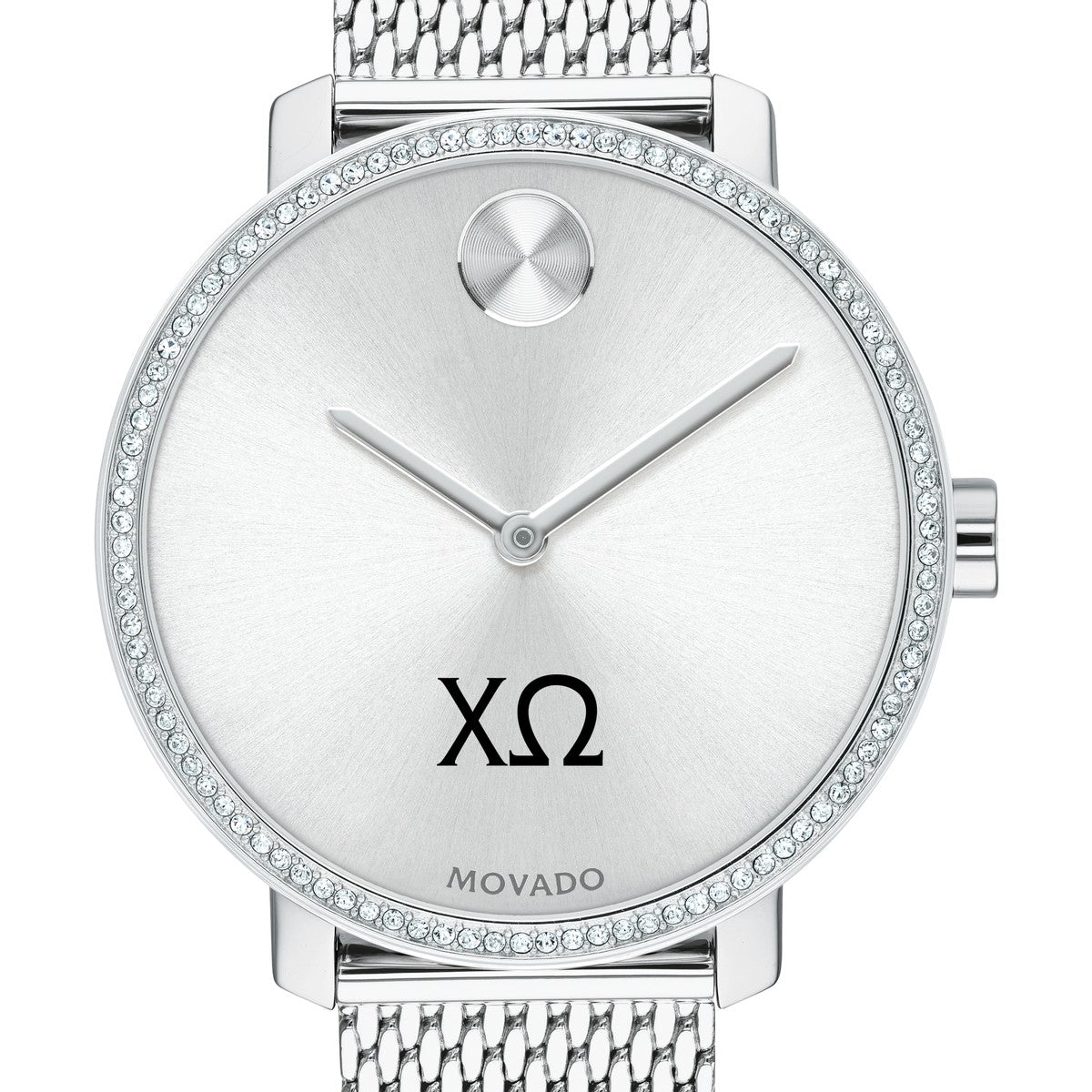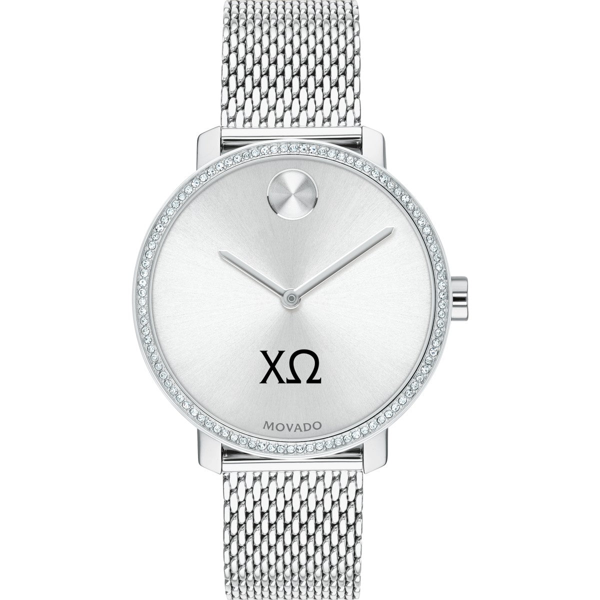 Chi Omega Women's Movado BOLD watch features the Chi Omega Logo in full color at 6 o'clock on silver sunray dial.