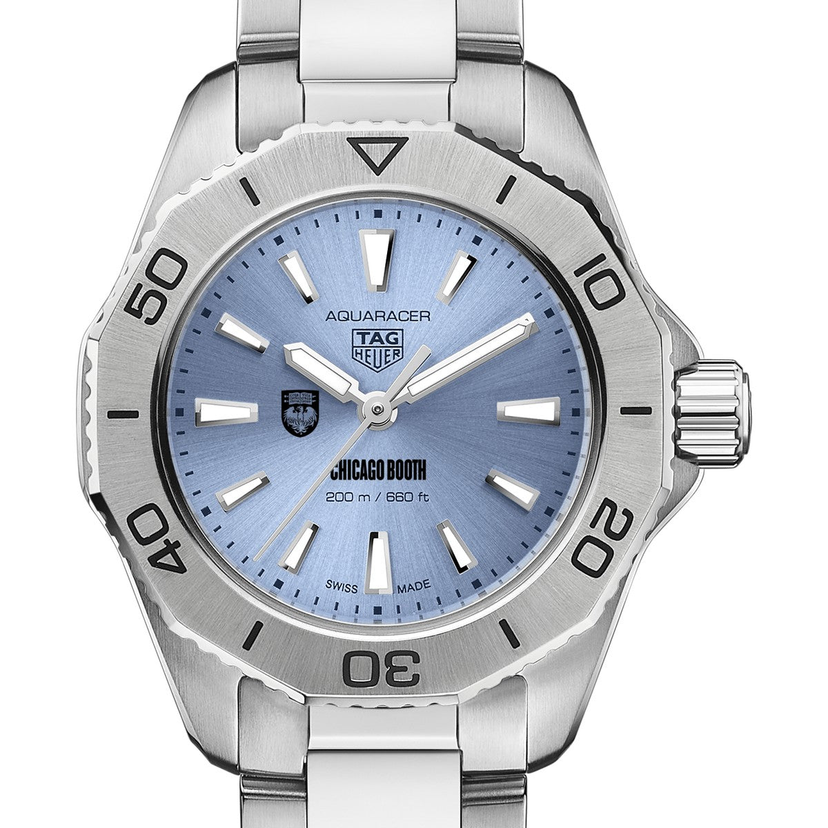 The Chicago Booth Women's TAG Heuer Steel Aquaracer with Blue Sunray Dial features the Chicago Booth logo on a stunning light blue sunray brushed dial. Complimentary personal engraving.
