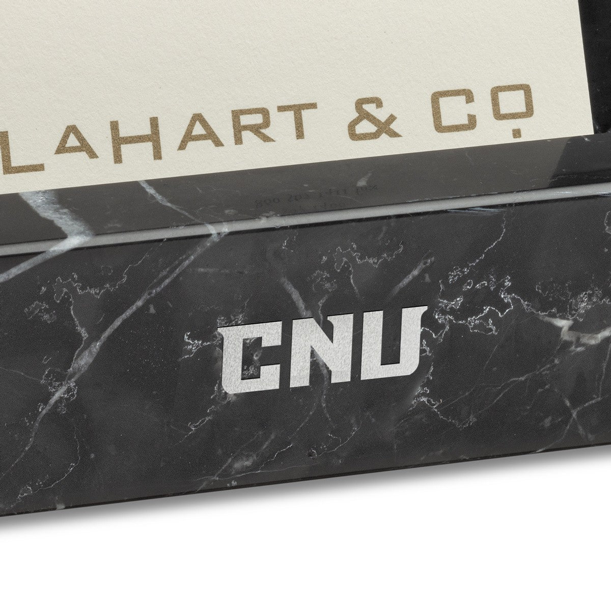 Perfect for new grads and seasoned professionals, the officially licensed Christopher Newport University marble cardholder is an essential for the desk of CNU fans. The CNU Logo is elegantly featured on the front of this substantial, solid marble card holder and accommodates all standard size business cards.