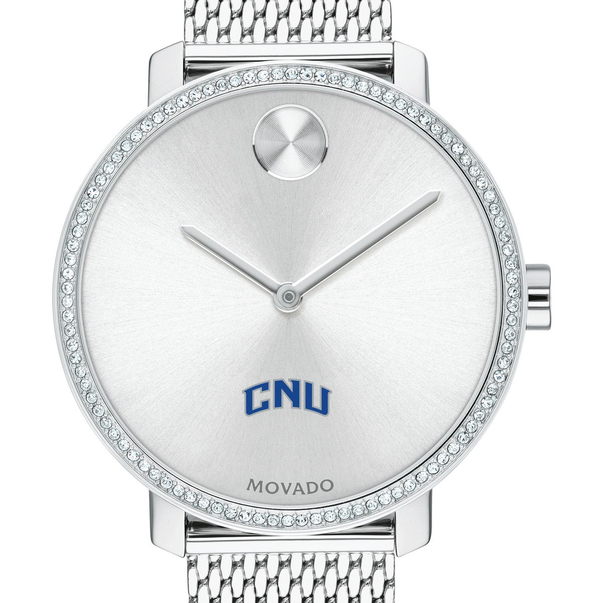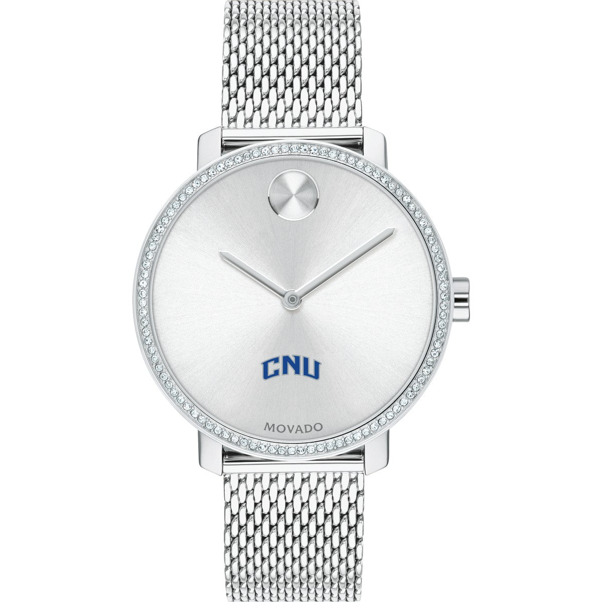 Christopher Newport University Women's Movado BOLD watch features the CNU Logo in full color at 6 o'clock on silver sunray dial.