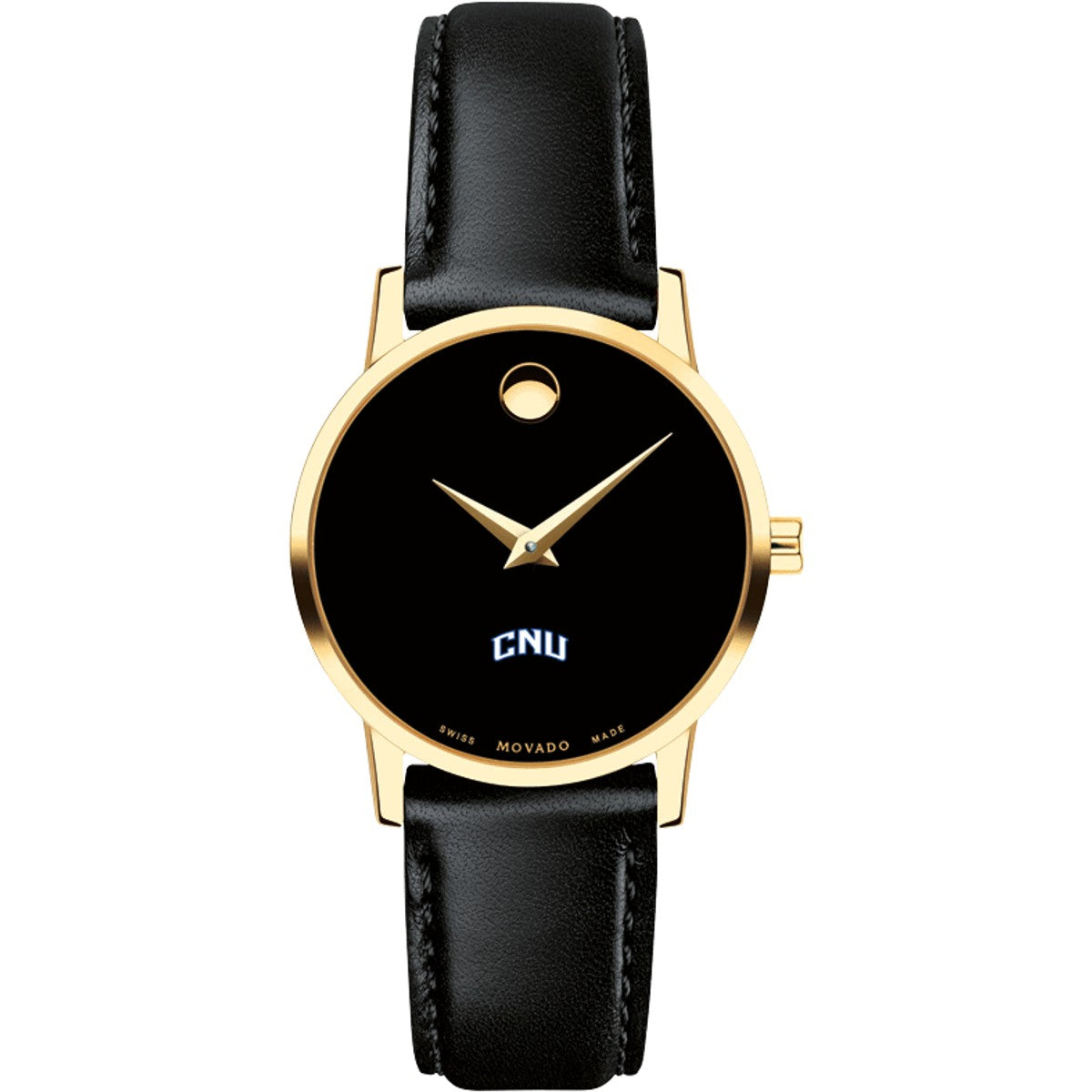 Christopher Newport University Women's Movado Museum watch features the CNU Logo in full color at 6 o'clock on black dial. Created in 1947, the iconic concave dot symbolizes the sun at high-noon. Complimentary personal engraving.