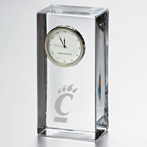 The Cincinnati Tall Glass Desk Clock stands proudly on any surface, distinctly etched with the Cincinnati logo. The clock showcases a traditional numbered face with a sweep hand to count the seconds.