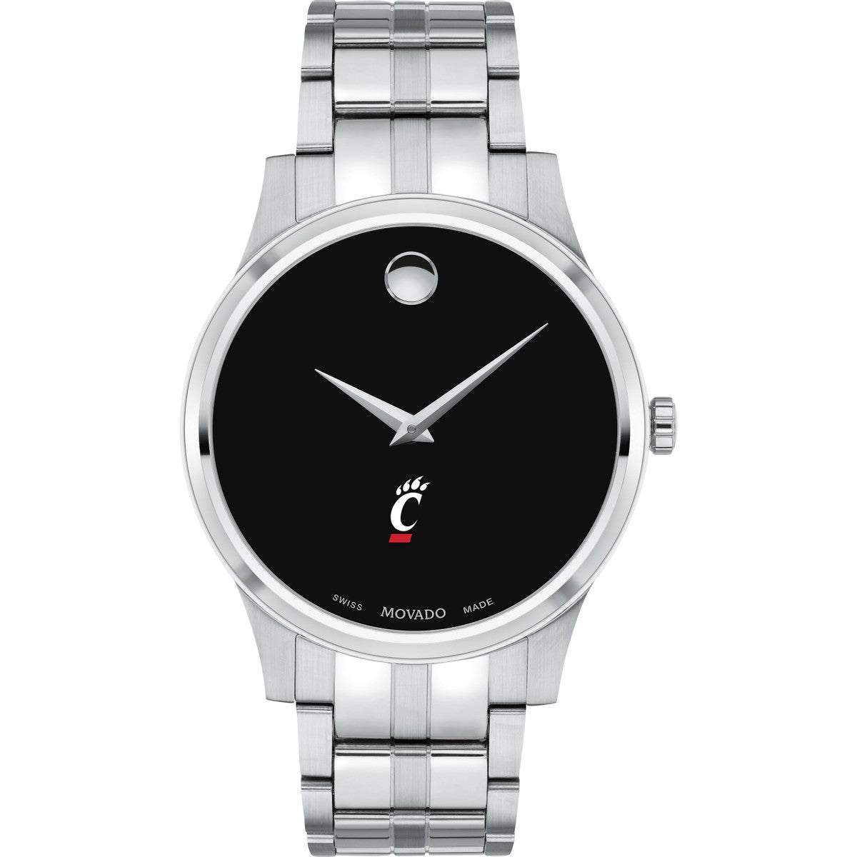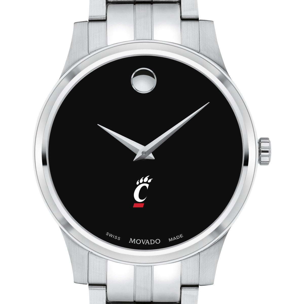 The University of Cincinnati Men's Movado Collection watch showcases the iconic Cincinnati logo in full color on a sophisticated black dial. This classic timepiece, featuring the renowned concave dot symbolizing the sun at high noon, has been a design masterpiece since its creation in 1947. Personalize your watch with free engraving without any delay to your order.