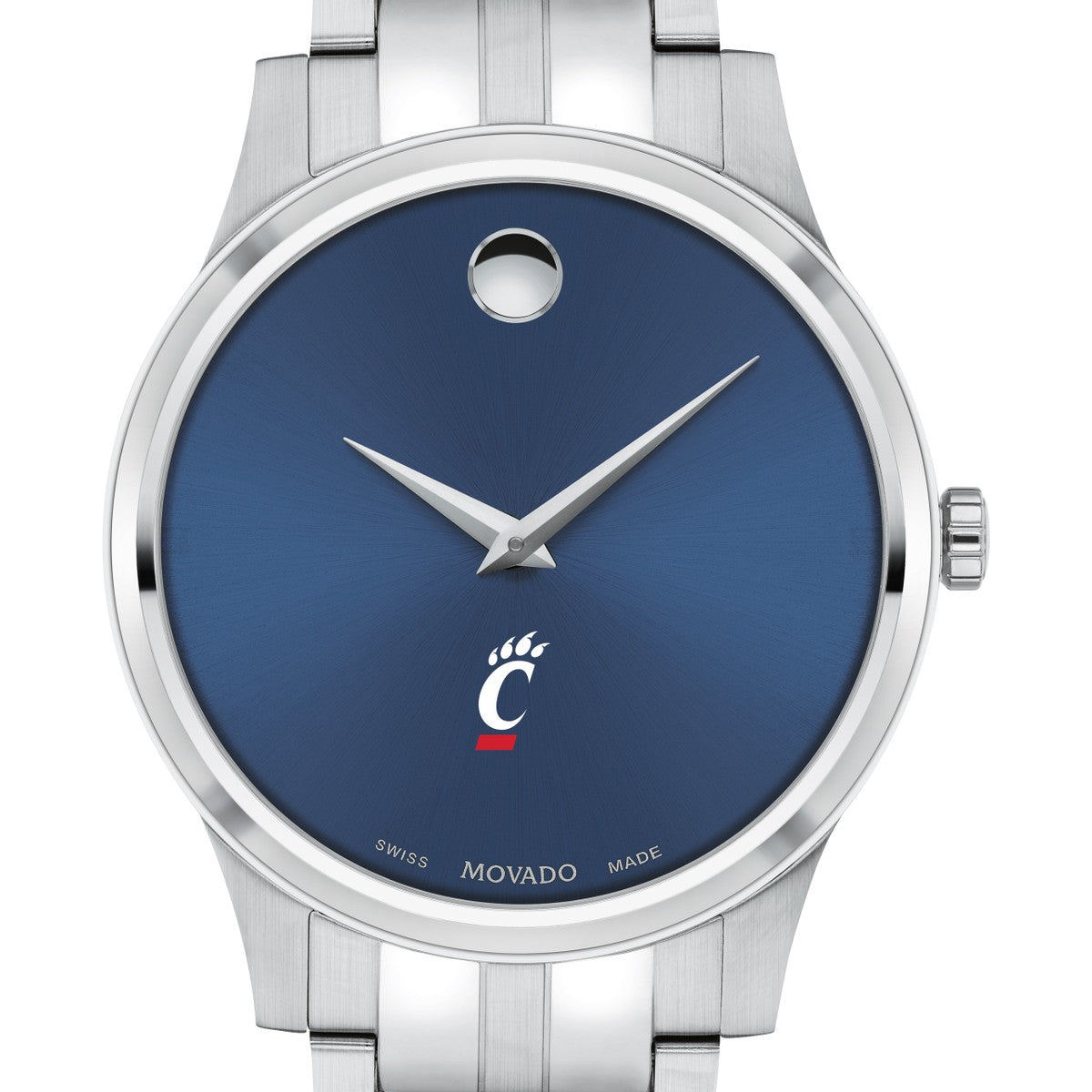 The University of Cincinnati Men's Movado Collection watch boasts a striking blue dial featuring the iconic Cincinnati logo in full color. This timeless timepiece, renowned for its concave dot representing the sun at high noon, has been a symbol of elegance since its inception in 1947. Make it uniquely yours with free engraving without affecting order processing time.
