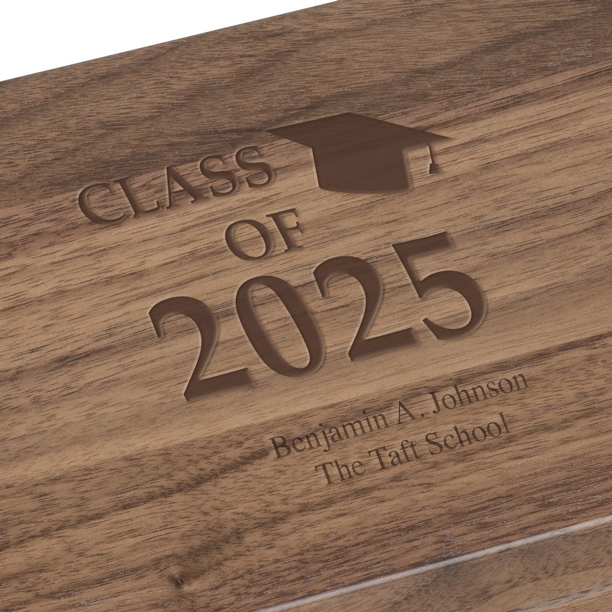 Our beautiful solid walnut desk box is made from hand-selected domestic walnut and crafted in the USA. Each box is hand finished with care, and proudly displays the Class of 2025 design on the lid, showcasing your new grad's accomplishment.