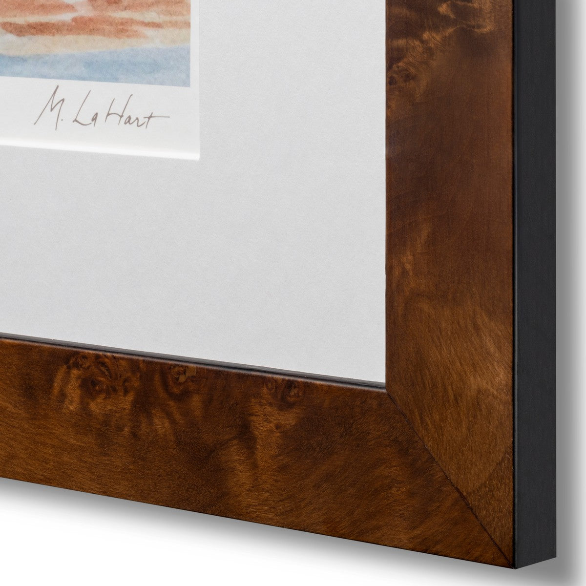 - The frame is crafted with Italian polished poplar burl veneer, 3/4" thick; museum quality matting