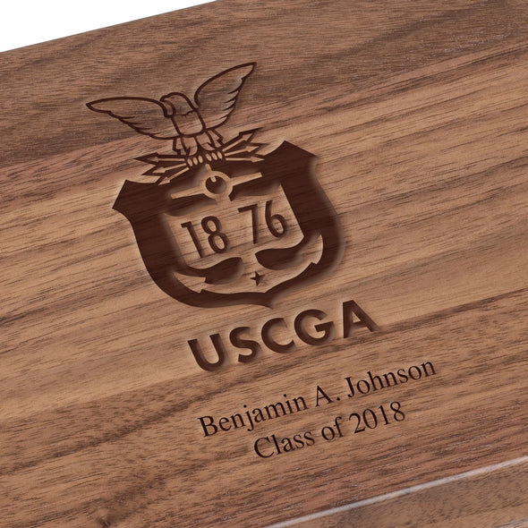 Our beautiful solid walnut desk box is made from hand-selected domestic walnut and crafted in the USA. Each box is hand finished with care, and proudly displays the USCGA Logo on the lid.