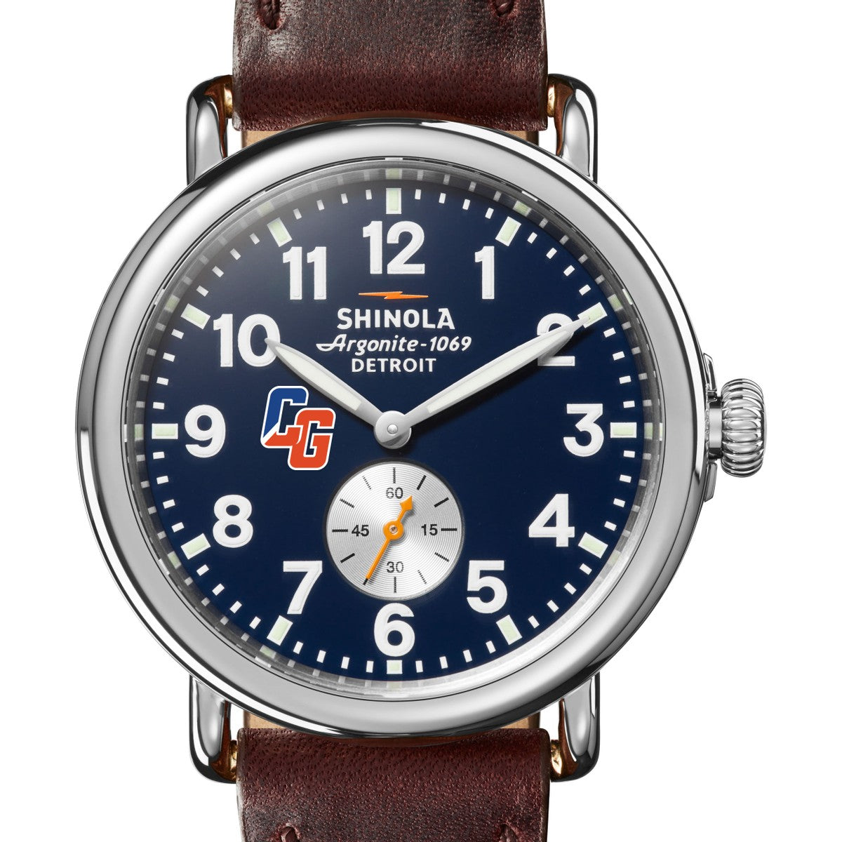 The Shinola Runwell features the USCGA Logo in color on the handsome midnight blue dial with a 41 mm case in polished stainless steel for a classic look. Shinola's original flagship timepiece. Complimentary personal engraving